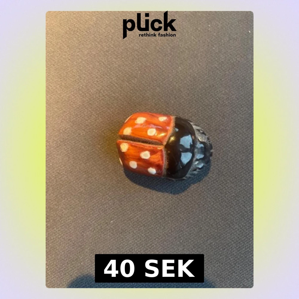Supergullig nyckelpiga, handmålad i rött, svart och vitt med prickigt mönster. Tillverkad i lera. Fin prydnadssak