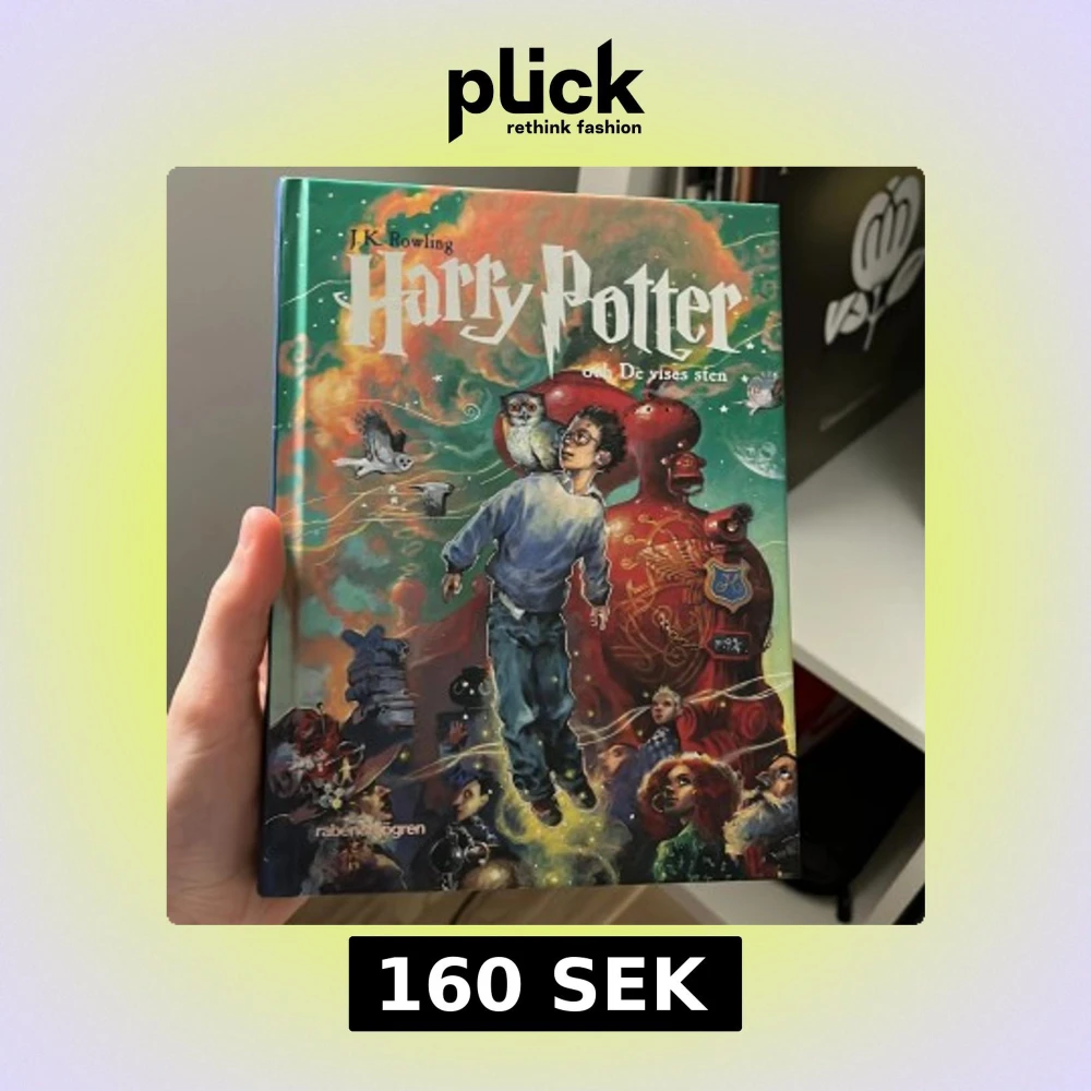Säljer boken 'Harry Potter och De vises sten' av J.K. Rowling. Denna utgåva har ett färgglatt omslag med illustrationer av Harry Potter och andra magiska element. Perfekt för fans av fantasy och magi! 📚✨