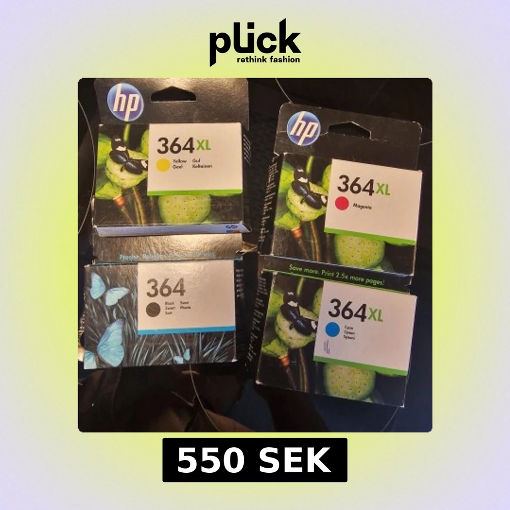 Säljer fyra HP 364 och 364XL bläckpatroner i färgerna gul, magenta, cyan och svart. Patronerna är i originalförpackning och passar till skrivare som använder HP 364-serien. Perfekt för dig som vill ha extra bläck hemma. 550 kr till alla 4 eller 150 till värje en