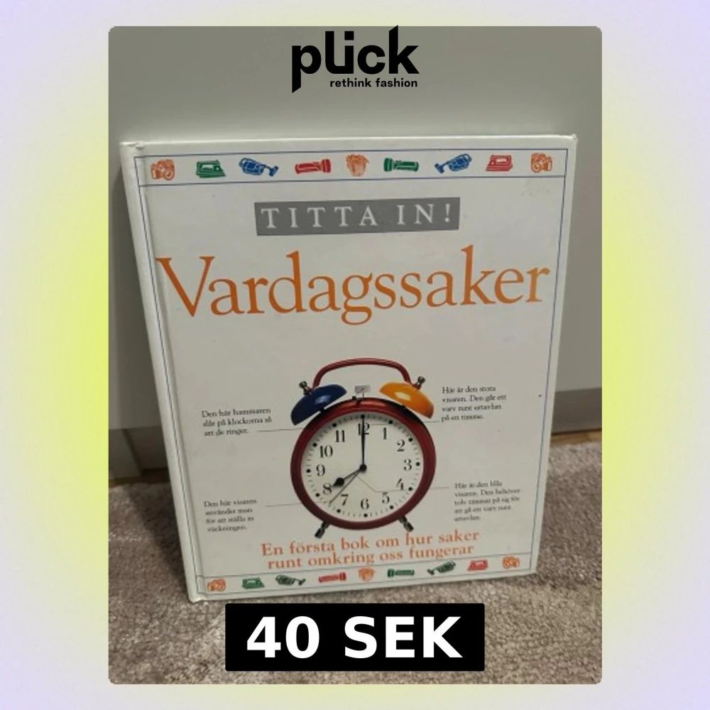 En illustrerad faktabok som förklarar hur olika vardagssaker fungerar. Omslaget är vitt med färgglada illustrationer av saker som väckarklocka, kamera och telefon. Perfekt för dig som är nyfiken på teknik och prylar i hemmet.