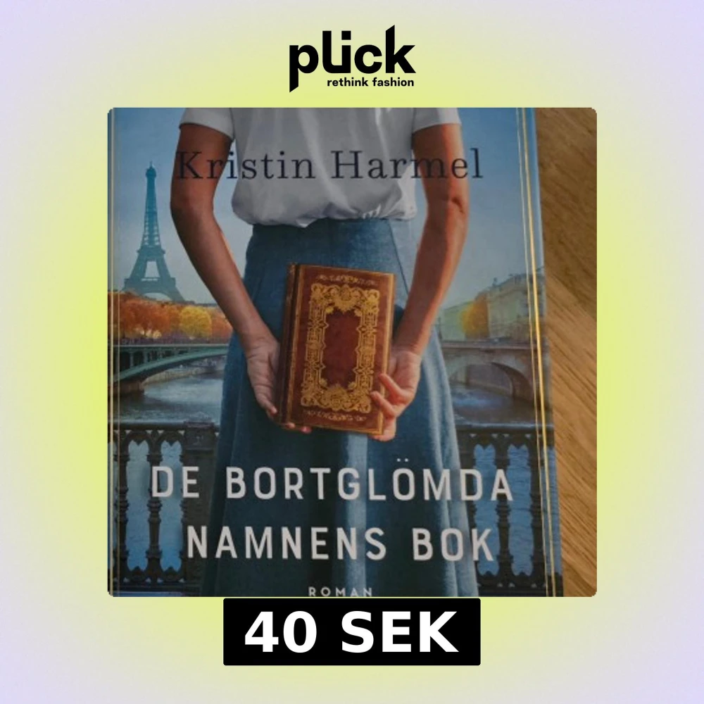 Romanen 'De bortglömda namnen' av Kristin Harmel utspelar sig i Paris. Omslaget visar en person som håller en bok med ett dekorativt mönster, med Eiffeltornet i bakgrunden. Perfekt för dig som älskar historiska romaner med en touch av mystik.