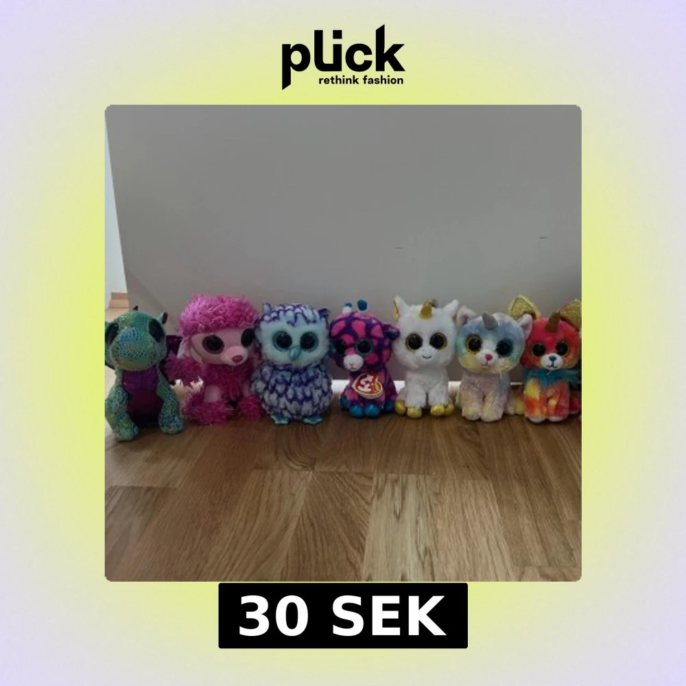 En rad med färgglada gosedjur med stora ögon. Från märket Ty, 30kr st eller alla för 180kr. 📩 Skicka gärna ett meddelande vid frågor eller om du vill ha flera bilder! 🌸😊 📦 Jag skickar snabbt och packar alltid med omsorg!