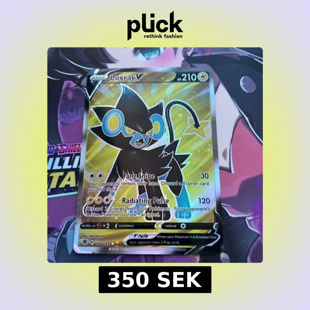 Säljer ett samlarkort från Pokémon-serien: Luxray V med 210 HP. Kortet har en guldfärgad, glansig yta och visar Luxray i en dynamisk pose. Text och attacker på engelska. Perfekt för samlare eller Pokémon TCG-spelare.