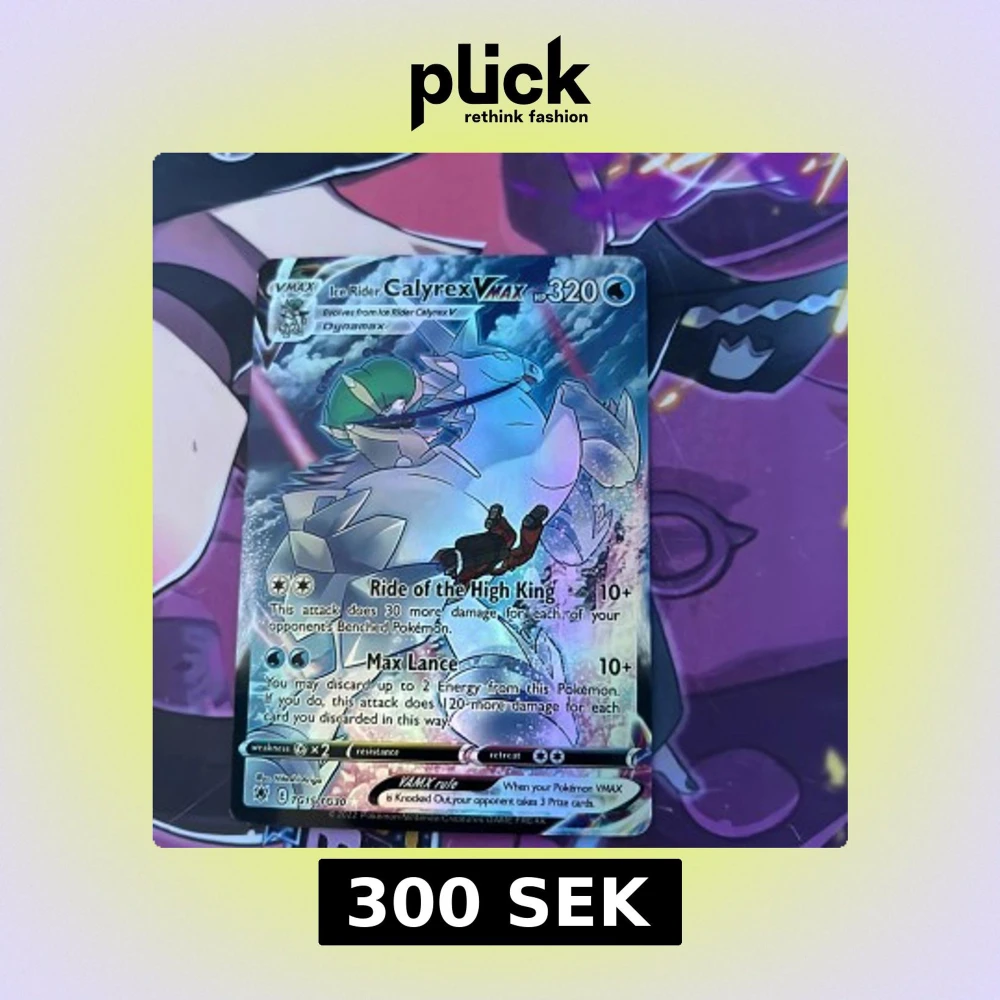 Säljer ett holografiskt Pokémonkort: Ice Rider Calyrex VMAX med 320 HP. Kortet har färgstark design med blå, vit och grön färg, samt glittrig yta. Text på engelska och illustration av Calyrex på en ishäst. Perfekt för samlare eller Pokémon TCG-spelare.