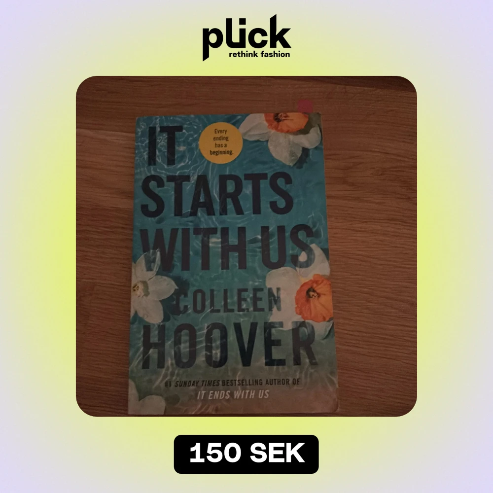 Säljer boken 'It Starts With Us' av Colleen Hoover. Omslaget är blått med vita och orange blommor. Perfekt för dig som älskar romantiska berättelser och vill veta vad som händer efter 'It Ends With Us'.