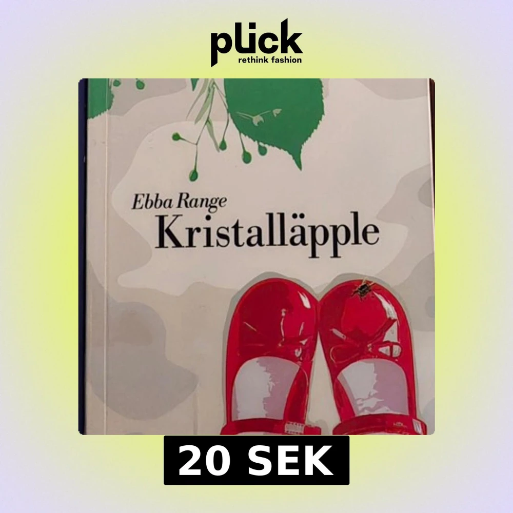 Boken 'Kristalläpple' av Ebba Range har ett omslag med en illustration av röda skor och gröna blad. Titeln är tryckt i svart mot en ljus bakgrund.