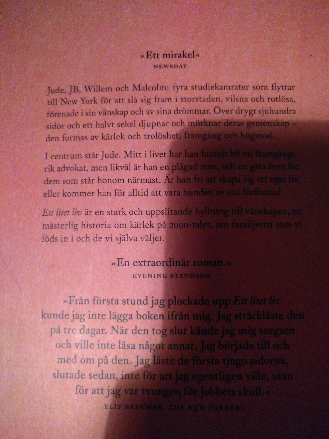 Boken ett litet liv i iprincip nyskick läst första kapitlet sedan läste jag resten i en annan upplaga. Ganska stor och tjock men ändå lite pocket i pärmarna