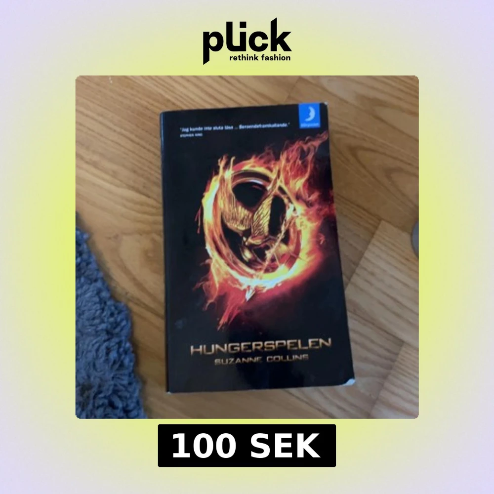Boken 'Hungerspelen' av Suzanne Collins är en spännande dystopisk roman. Omslaget är svart med en ikonisk symbol av en fågel i eld. Perfekt för dig som gillar äventyr