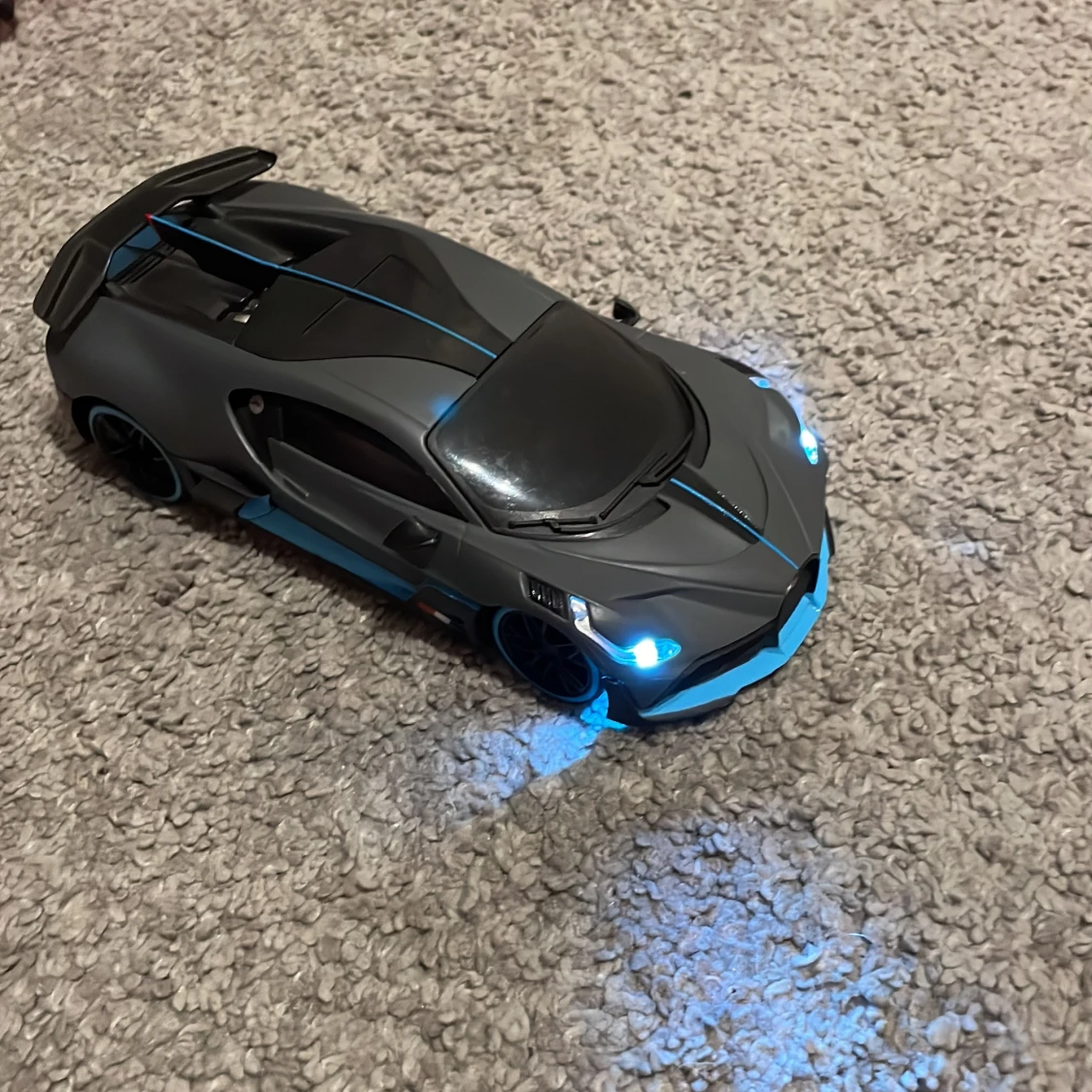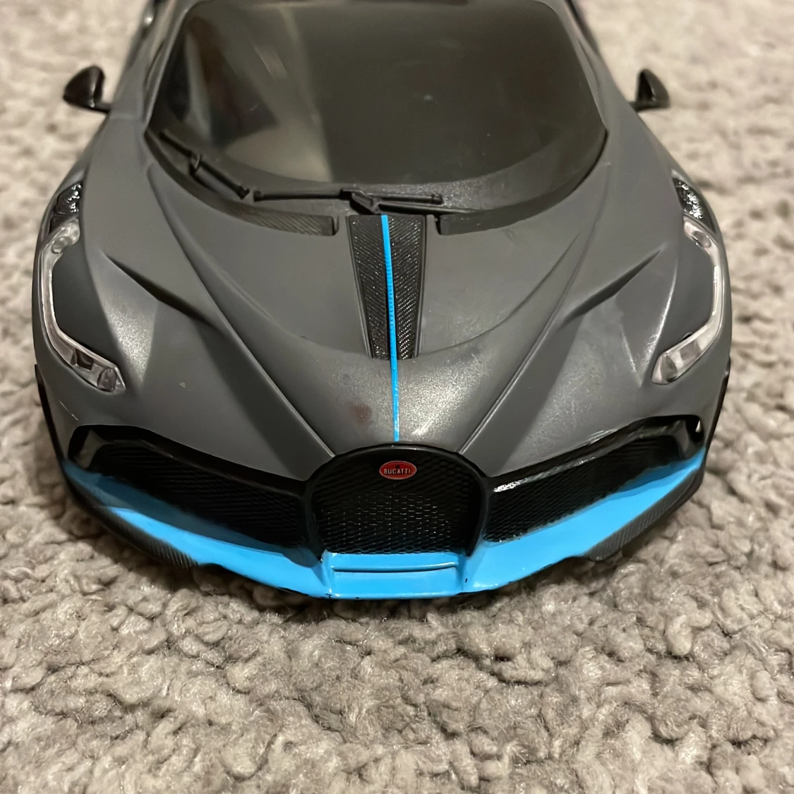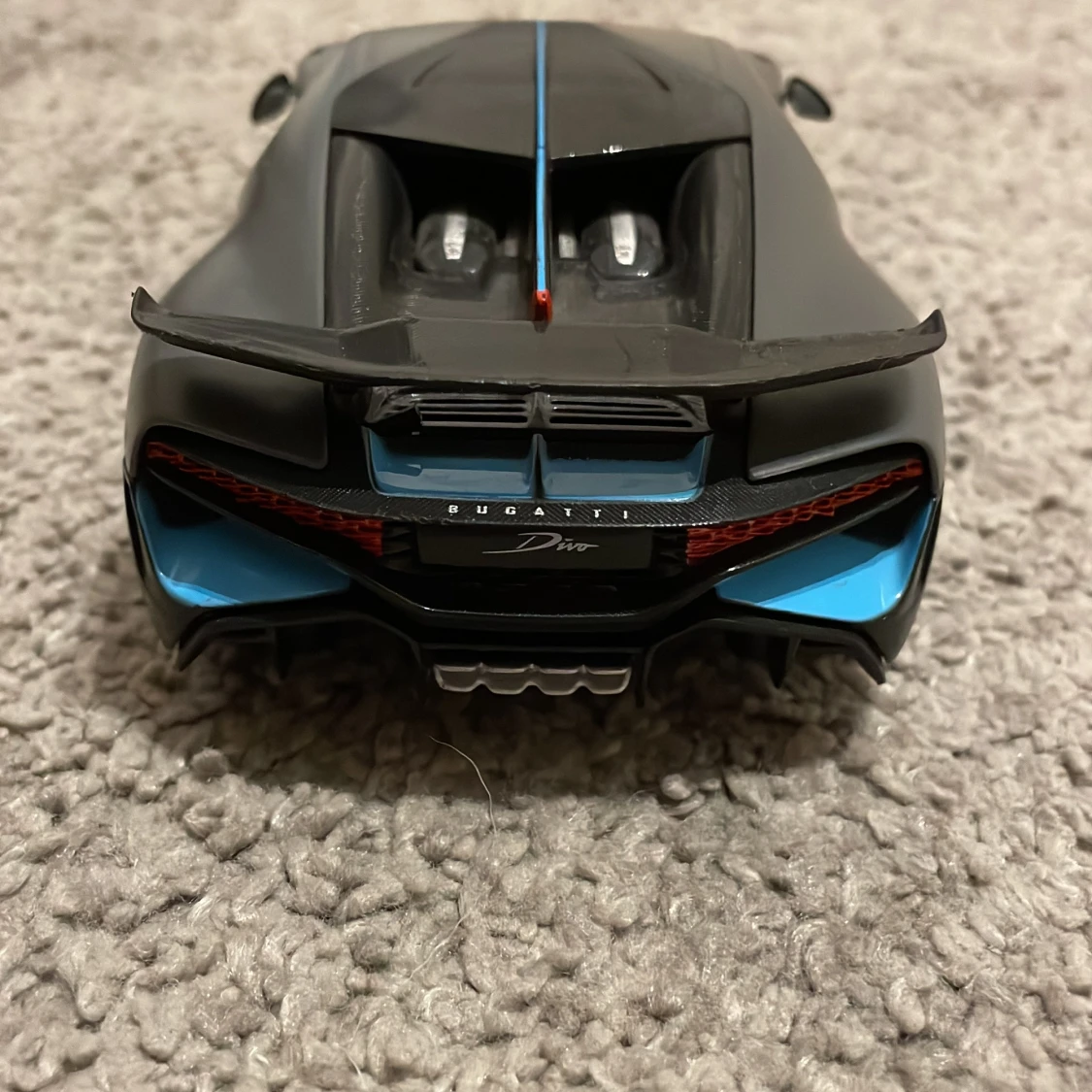 Bilderna visar en modellbil av Bugatti Divo i grått och blått, med sportig design och detaljerad finish. Perfekt för dig som älskar snabba bilar och coola samlarobjekt! Den passar utmärkt som dekoration eller till din bilsamling.