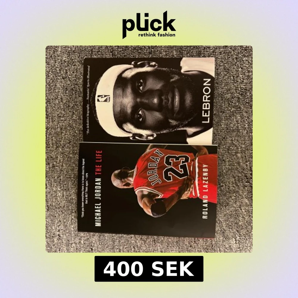 Två böcker till salu: en om LeBron James med ett svartvitt omslag och en om Michael Jordan med ett färgstarkt omslag där han bär sin ikoniska nummer 23-tröja. Perfekt för basketfans som vill fördjupa sig i dessa legendariska spelares liv och karriärer. 200 kr styck.