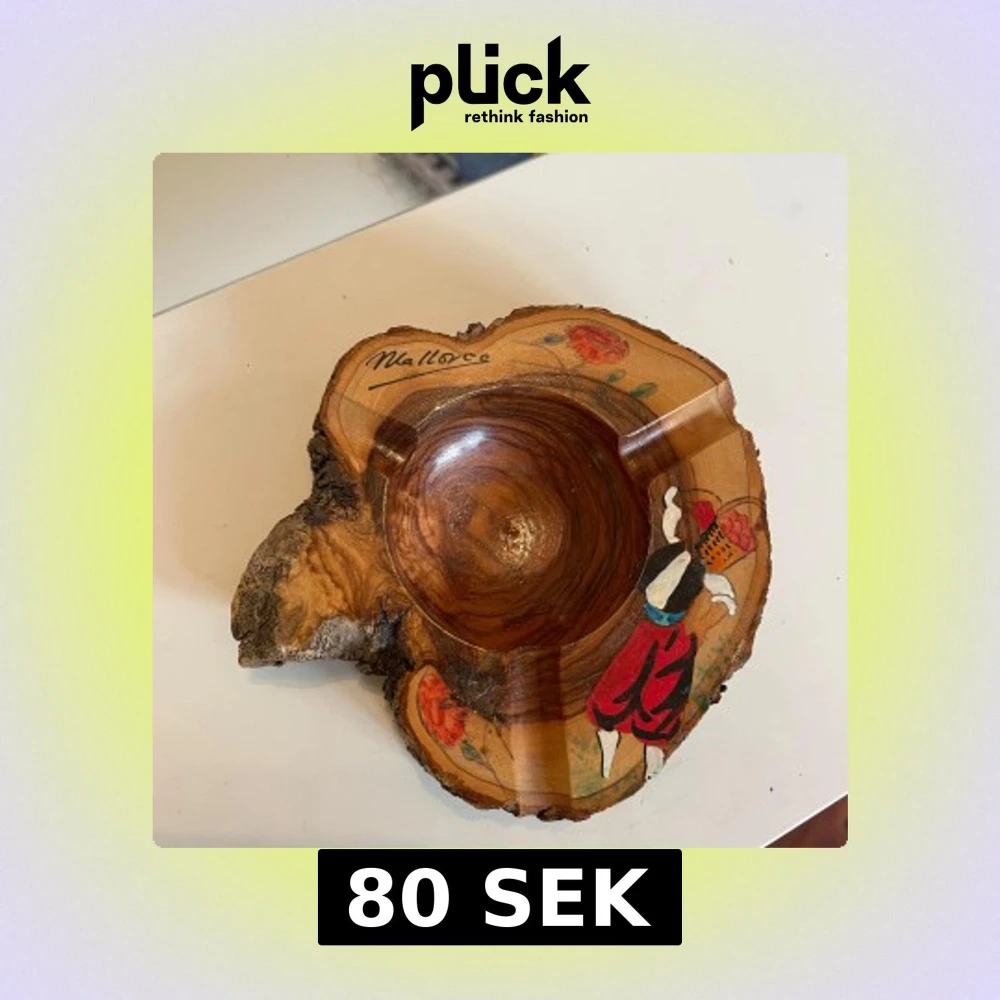 Unik vintage handgjord trä askkopp med en vacker målning av en traditionell dansare och blommor. Skålen har en naturlig träfinish och är märkt med 'Mallorca'.kan möta er i Stockholm utanför Åhléns