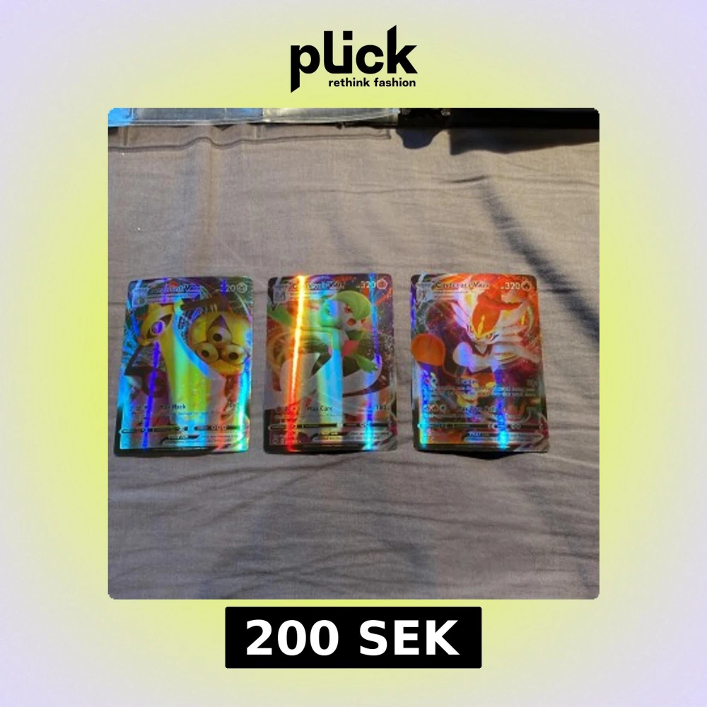 Tre stycken holografiska Pokémon VMAX-kort: Aegislash VMAX, Gardevoir VMAX och Cinderace VMAX. Alla har 320 HP och färgglad, glansig yta. Perfekt för samlare eller Pokémon-fans som vill utöka sin kortsamling.