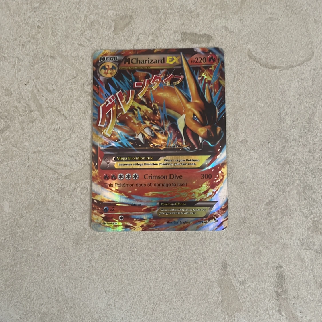 Cool och glittrig Pokémonkort med M Charizard EX! Perfekt för dig som samlar eller vill boosta din lek med en av de mest ikoniska och kraftfulla Pokémon. Kortet har färgstark design och är ett måste för alla Pokémon-fans.