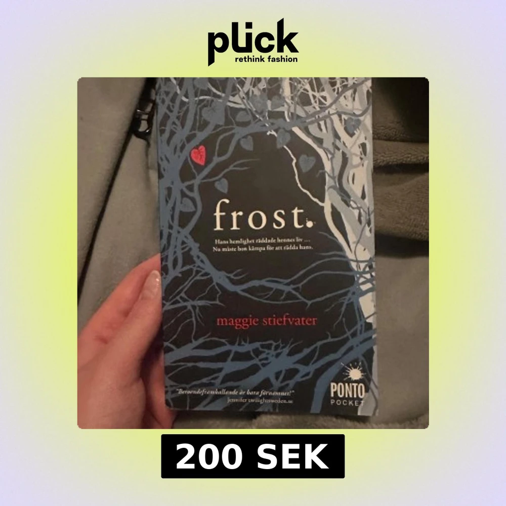 Pocketbok med titeln 'Frost' av Maggie Stiefvater. Omslaget har ett blått och svart mönster av grenar med ett rött hjärta. Boken är utgiven av Ponto Pocket.