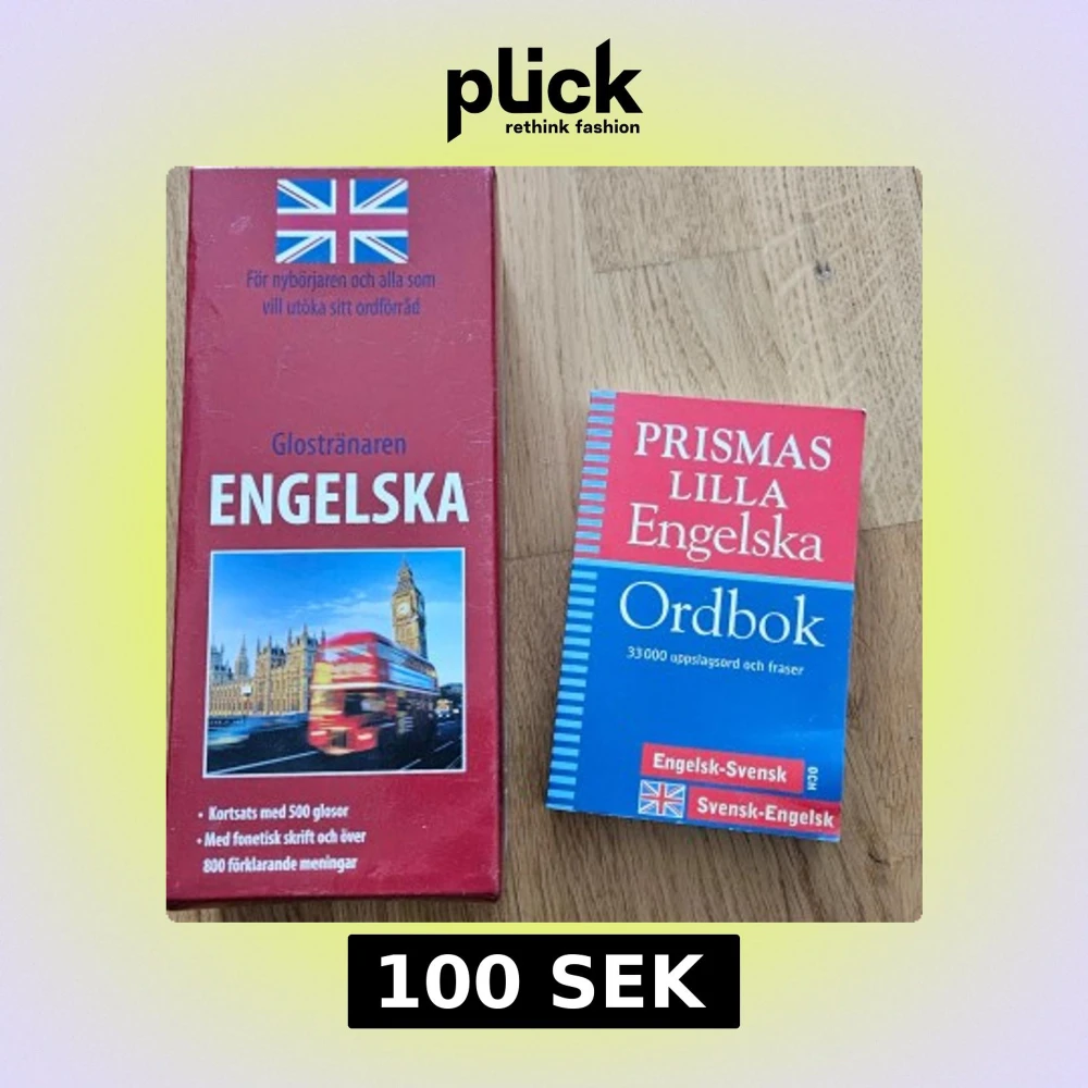 Säljer ett set med Glostränaren Engelska och Prismas Lilla Engelska Ordbok. Glostränaren innehåller kort med 500 glosor och förklarande meningar, perfekt för nybörjare. Ordboken har 33 000 uppslagsord och fraser, engelsk-svensk och svensk-engelsk.