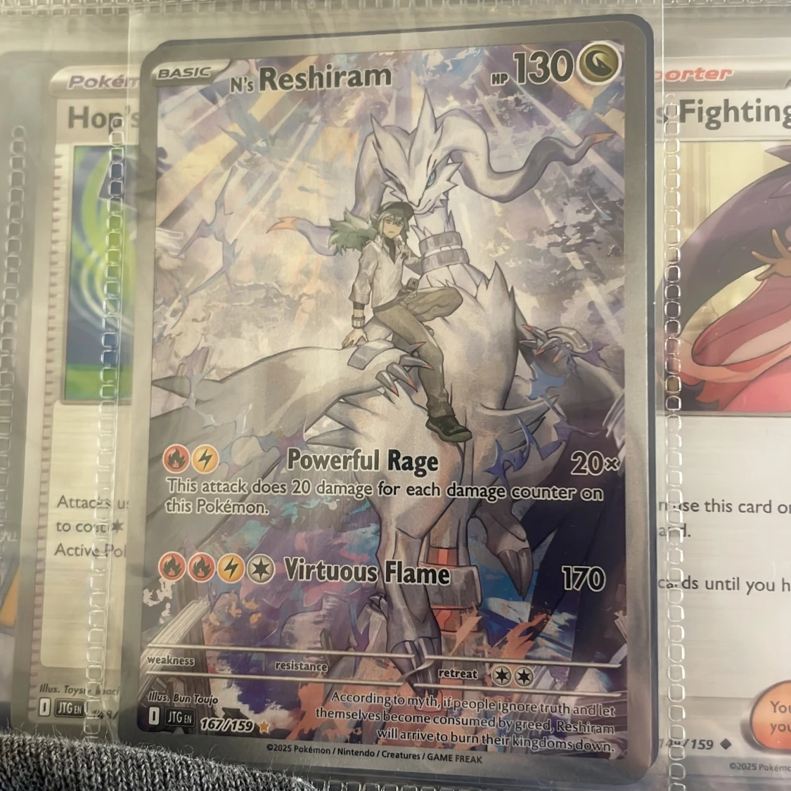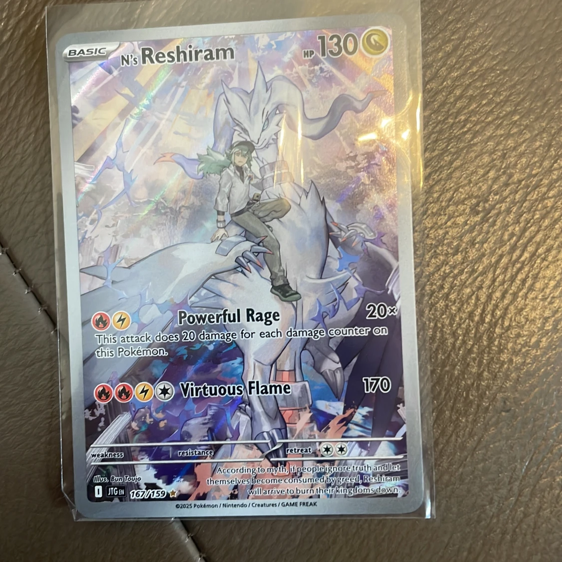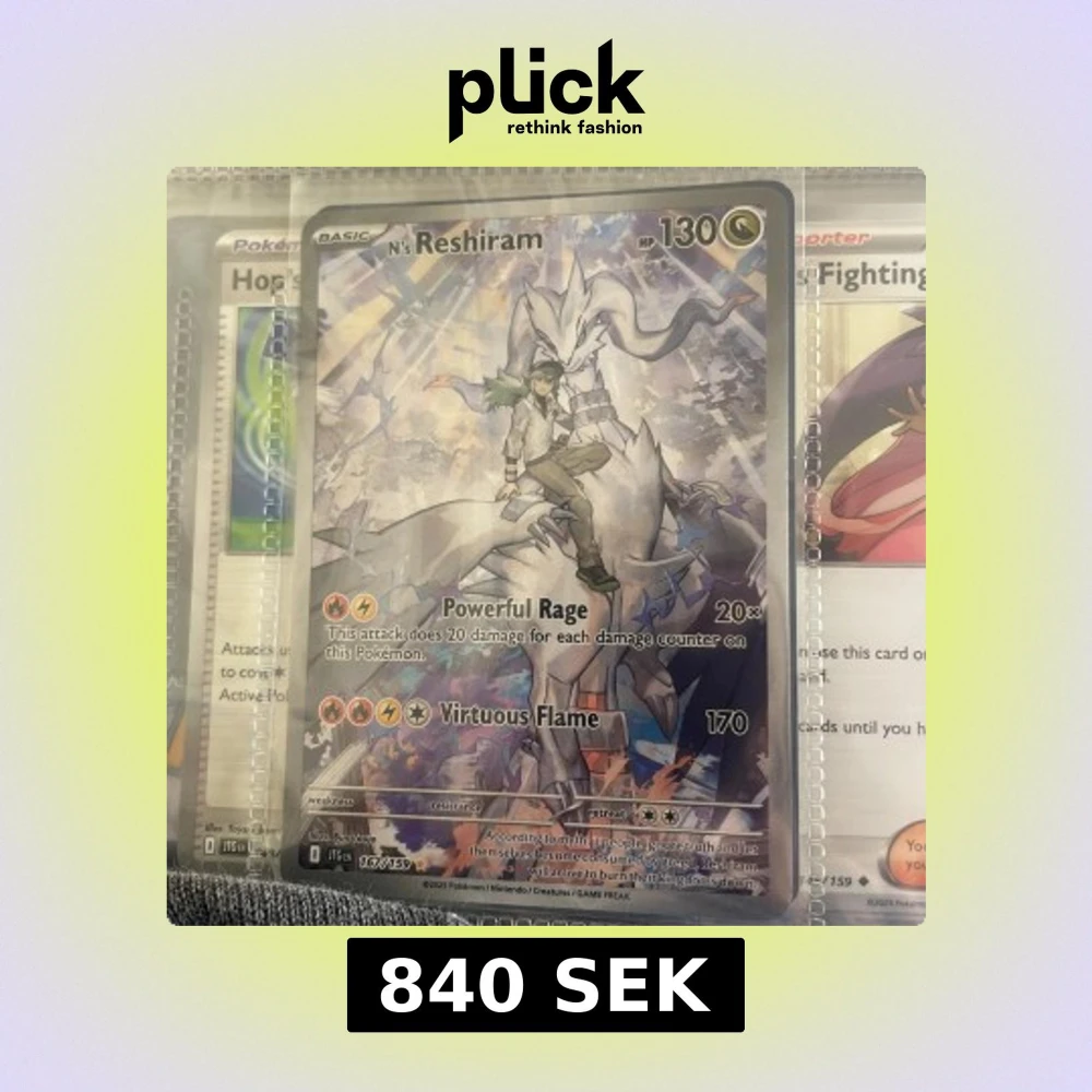 Cool Pokémonkort med Reshiram och N i en episk pose! Kortet har snygg holoeffekt och attacker som Powerful Rage och Virtuous Flame. Perfekt för samlare och fans av Pokémon som vill ha något unikt i sin samling.
