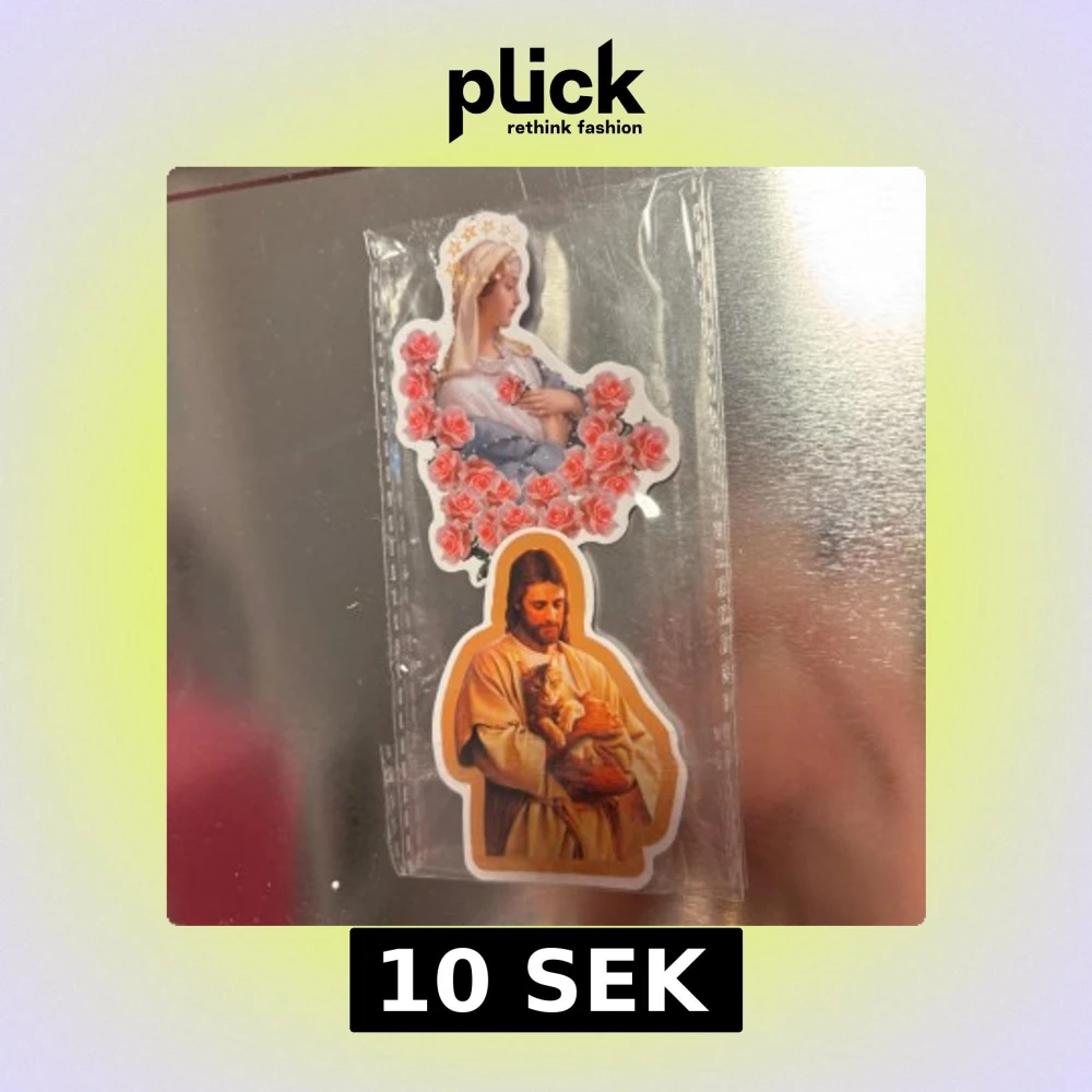 Två religiösa klistermärken, ett med en kvinna omgiven av rosor och ett med en man i gul klädsel som håller ett lamm.