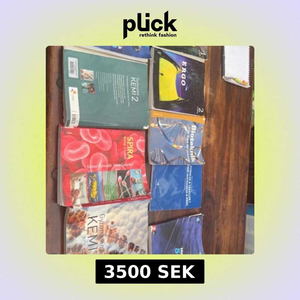 Paketpris (alla böcker) - 3500 Styckpris (en bok) Matematik 1c 5000 - 280 kr Matematik 2c 5000 - 280 kr Matematik 4 5000 - 280 kr Gymnasie Kemi 1 - 600 kr Gymnasie kemi 2 (rivet framsida) - 550 kr Ergo fysik 1 - 180 kr Ergo fysik 2 - 600 kr Bioteknik från Dna till protein - 600 kr Formler och tabeller - 60 kr Spira Biologi 2 - 160 kr Spira biologi 1 - 160 kr