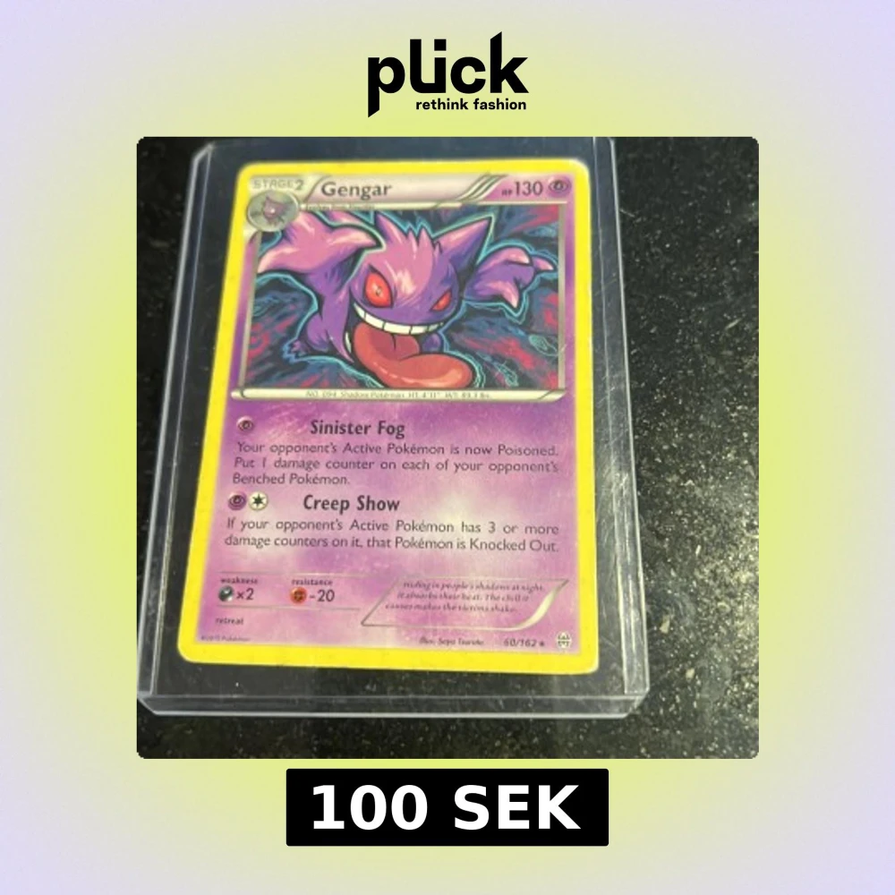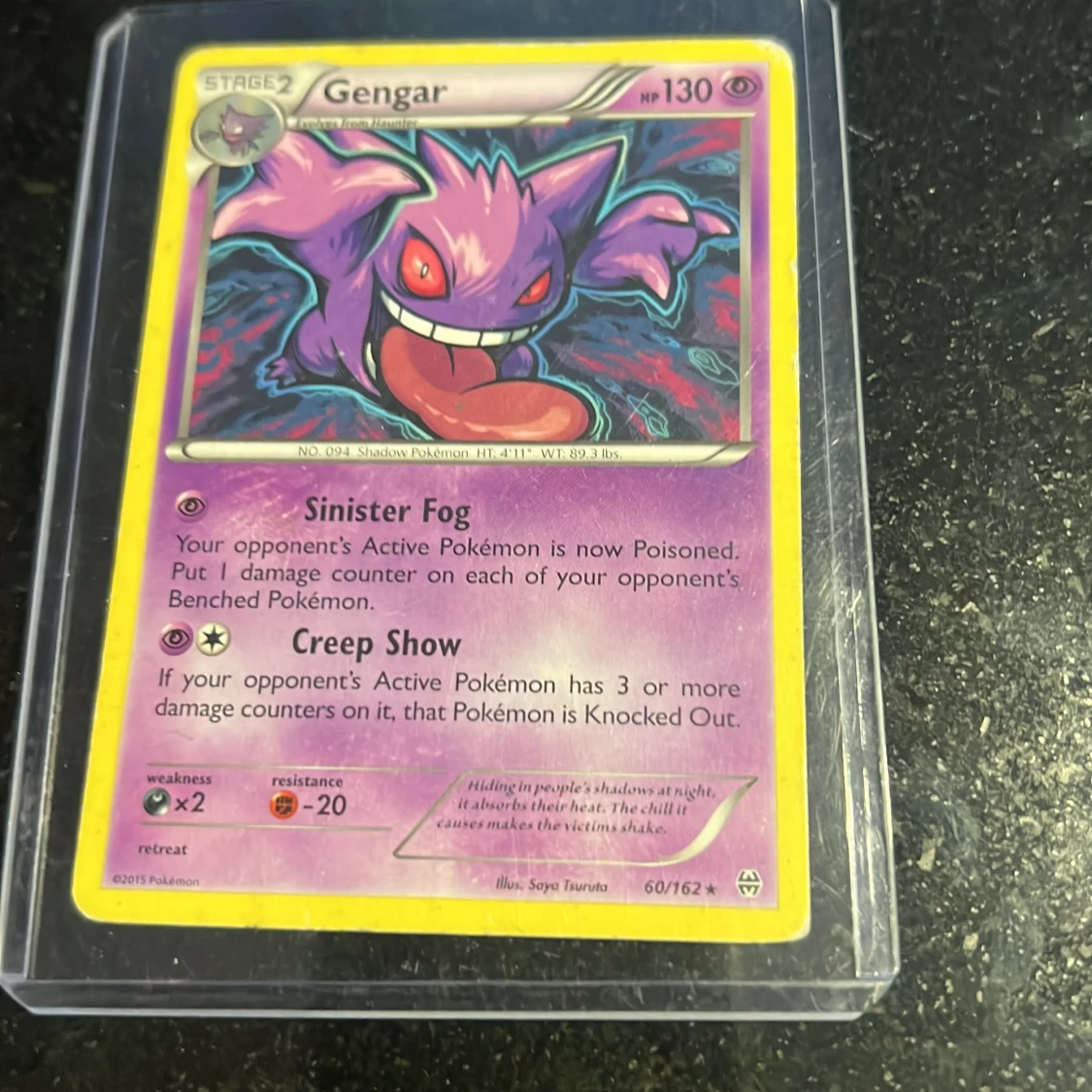 Samlarkort med Gengar, en populär Pokémon. Kortet har 130 HP och innehåller attacker som Sinister Fog och Creep Show. Perfekt för dig som gillar Pokémon och vill utöka din samling med ett coolt och klassiskt kort.