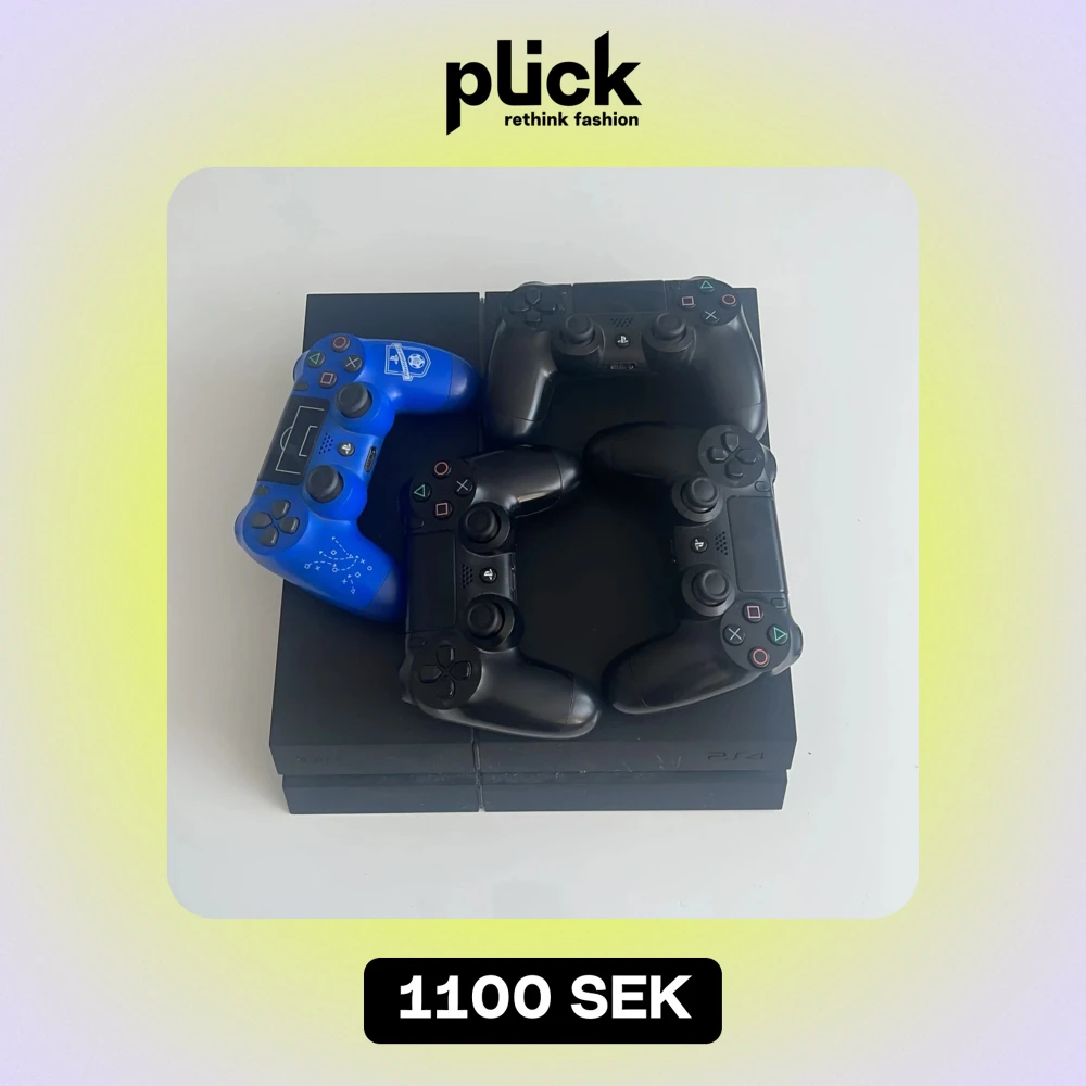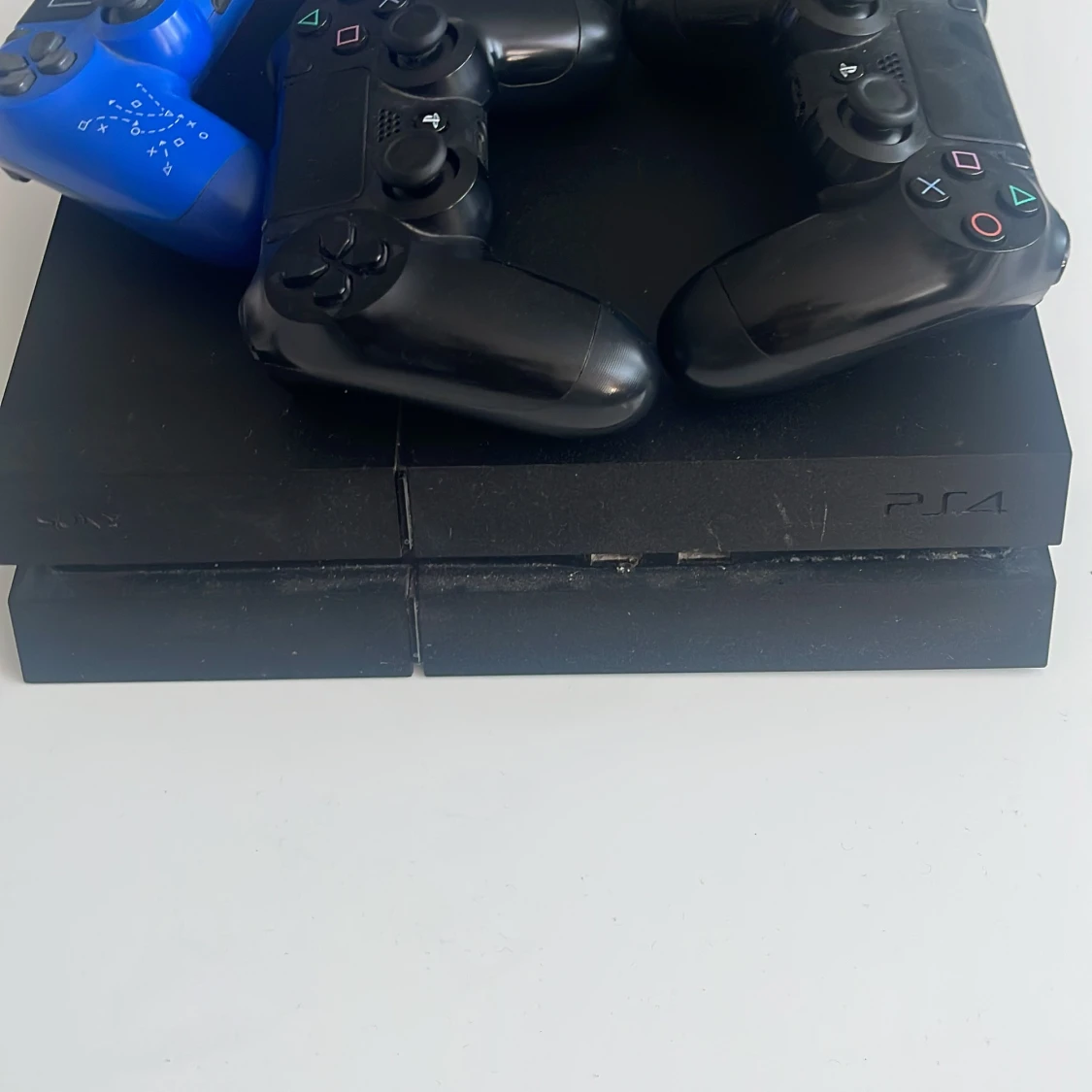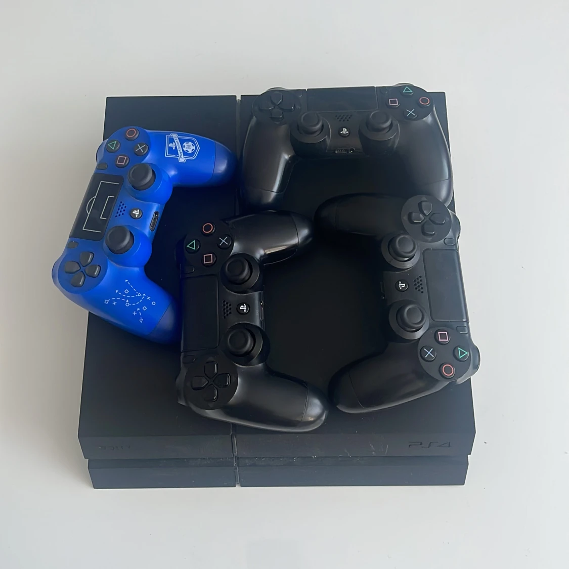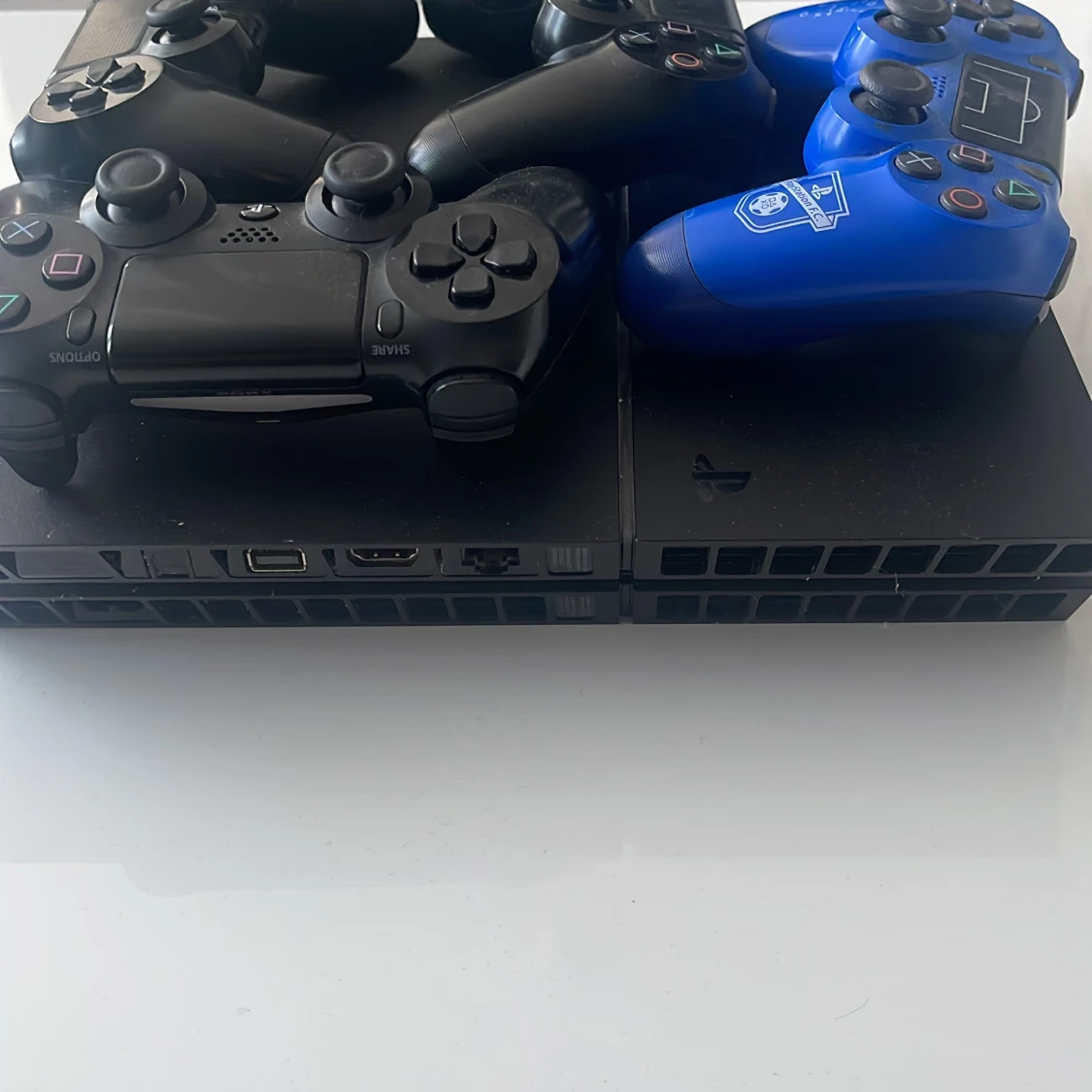 Säljer en PlayStation 4 med tre svarta och en blå kontroll. Den blå kontrollen har ett unikt mönster och logotyp. Konsolen är i bra skick och perfekt för spelkvällar med vänner. Alla kontroller är trådlösa och fungerar utmärkt. Perfekt för den som vill ha en komplett spelupplevelse! 🎮