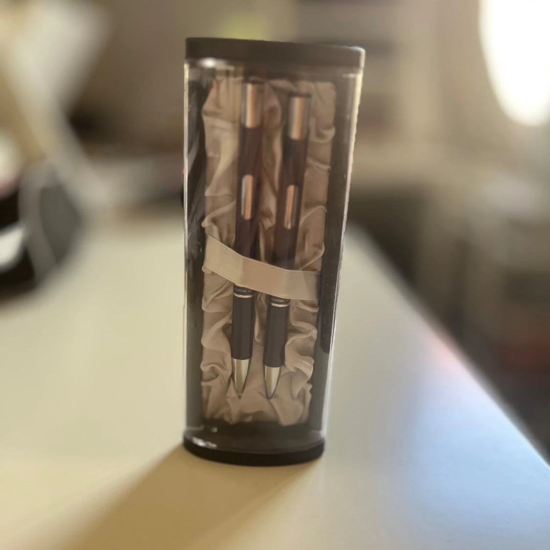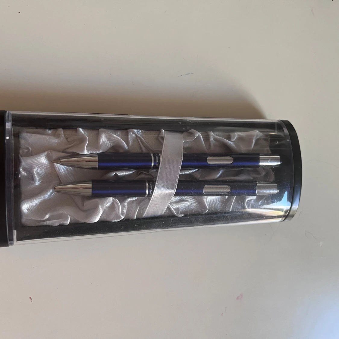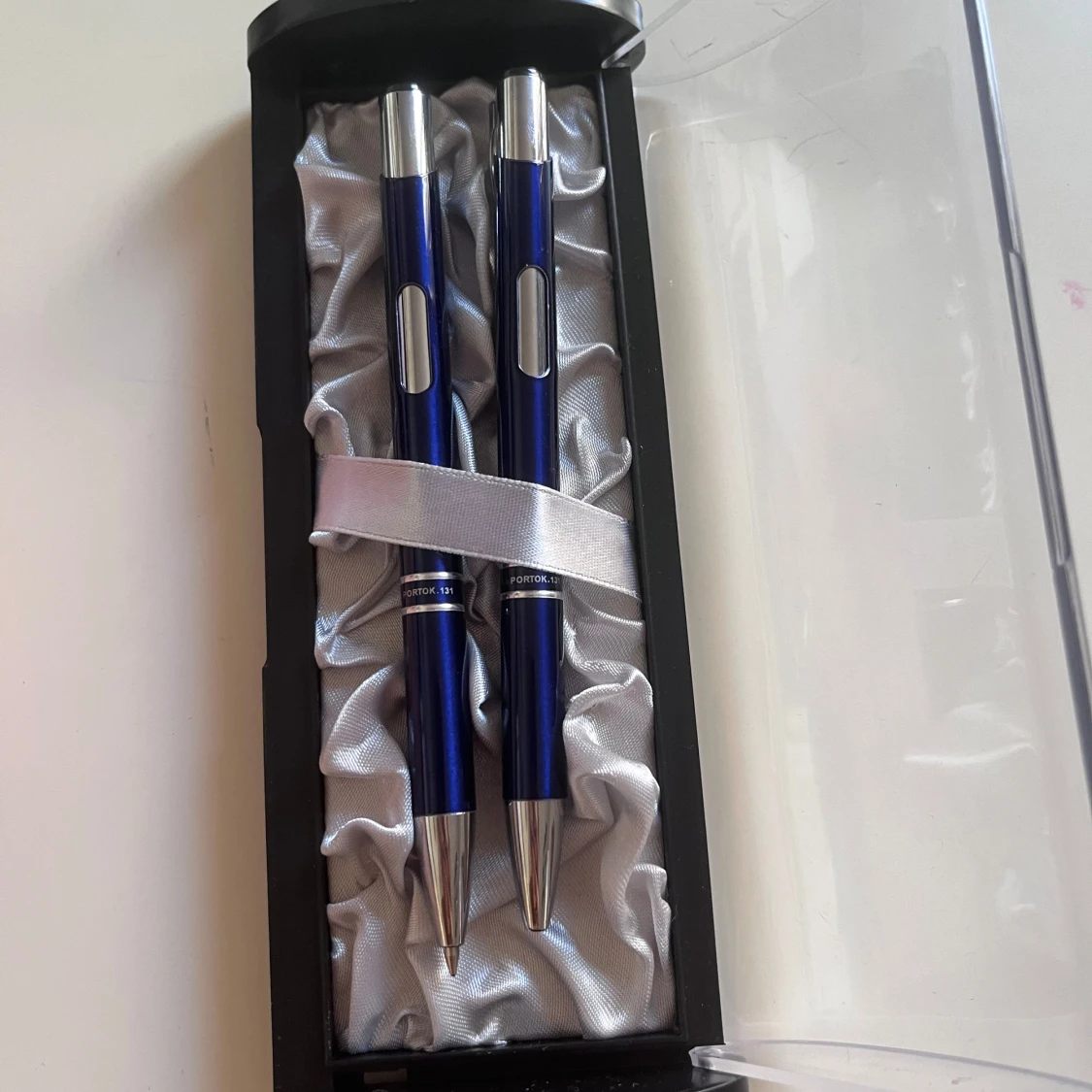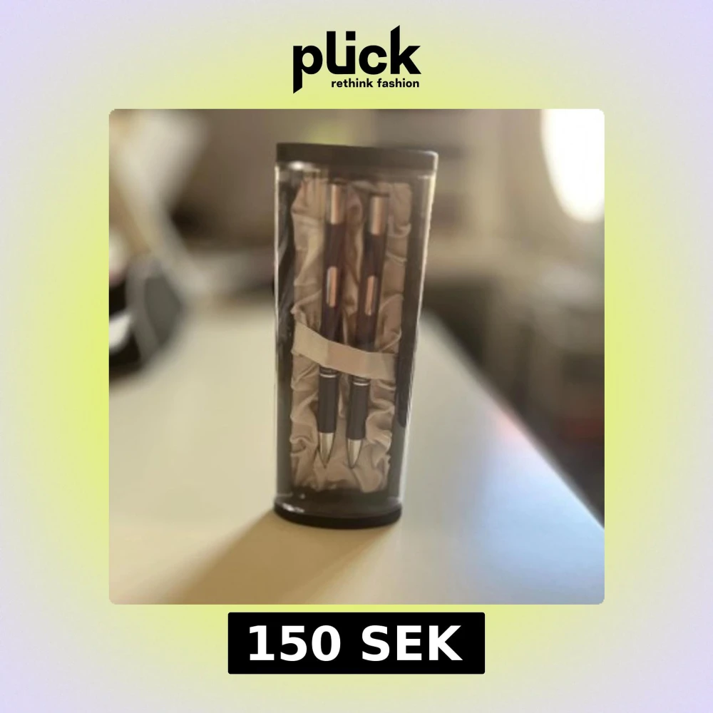 Pris kan diskuteras. Bilderna visar ett elegant pennset med två pennor i en lyxig presentförpackning. Perfekt för dig som vill skriva snyggt i skolan, på jobbet eller till dagboken. Pennorna har en modern design med metallfärgade detaljer och ligger i en silkeslen bädd. Ett stilrent tillbehör för unga kreatörer och studenter.