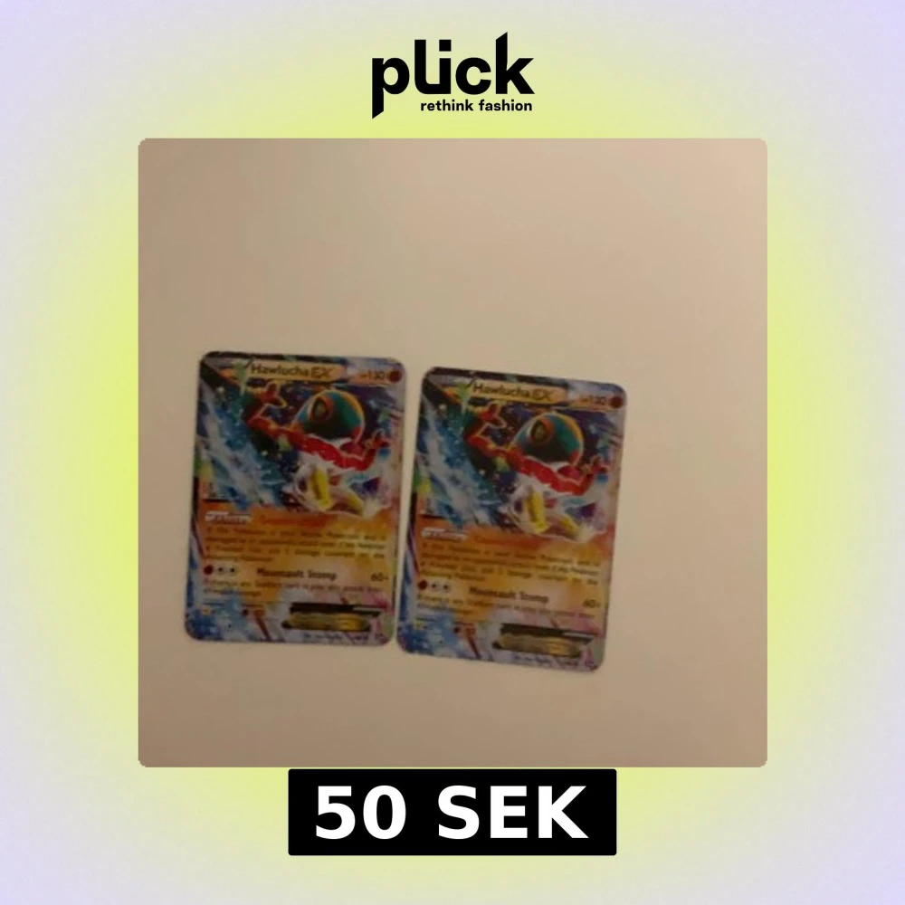 Två stycken Hawlucha EX Pokémonkort med färgglad design och holografisk effekt. Korten har en blå baksida med den klassiska Pokémon-loggan och en Pokéball i mitten. Perfekt för samlare eller Pokémon-entusiaster!