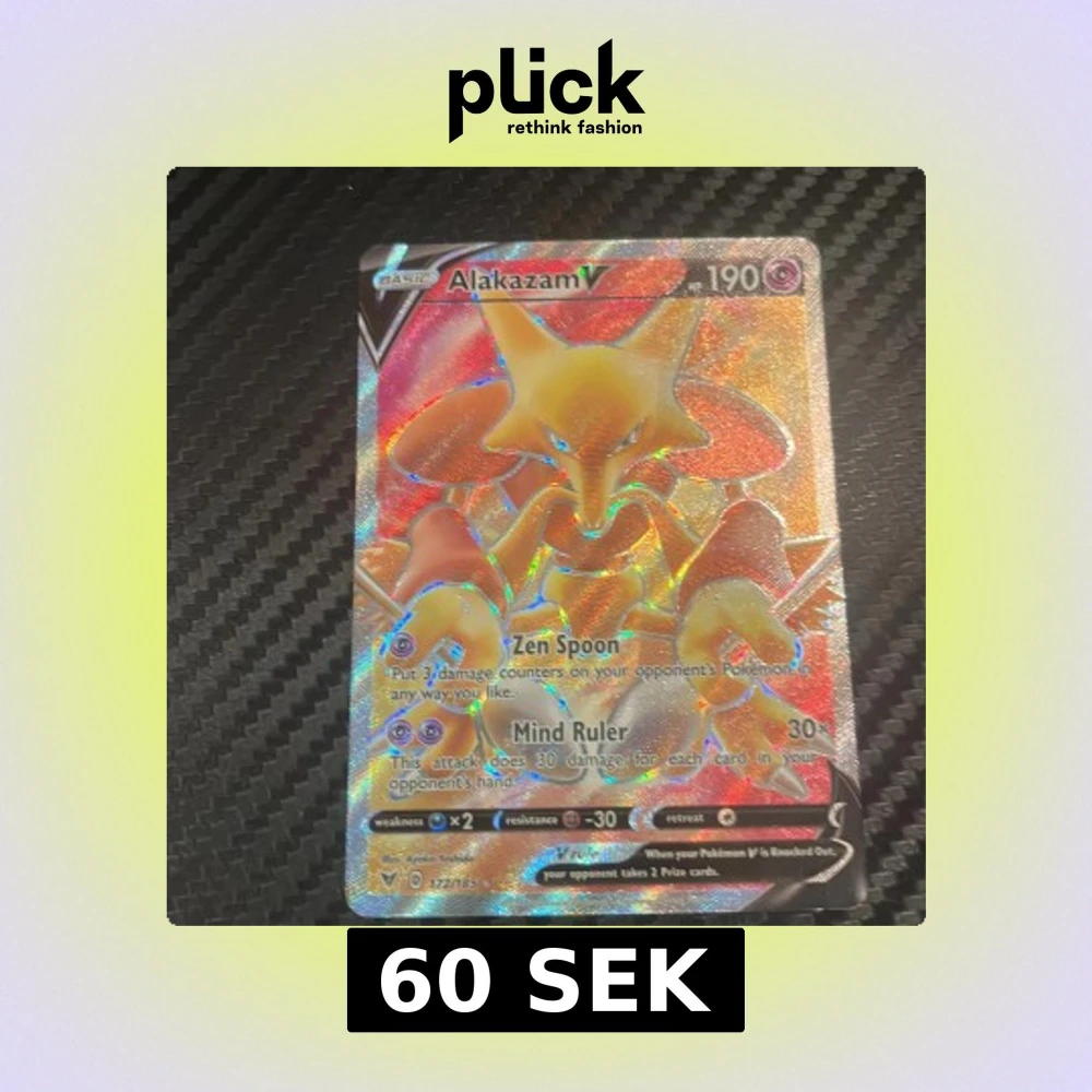 Coolt och glittrande Pokémonkort med Alakazam V! Perfekt för samlare och fans som vill boosta sin lek med en kraftfull och snygg karaktär. Kortet har unika attacker som Zen Spoon och Mind Ruler. Ett måste för dig som älskar Pokémon!