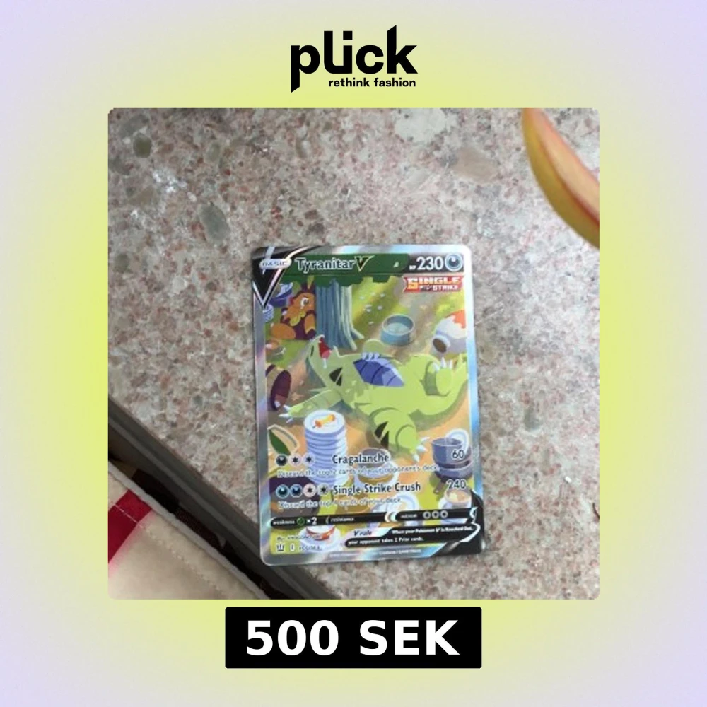 Säljer ett Pokémonkort av Tyranitar V från Single Strike-serien. Kortet har färgstark illustration där Tyranitar ligger bland matrester. HP 230, attacker Cragalanche och Single Strike Crush. Perfekt för samlare eller Pokémon-fans!