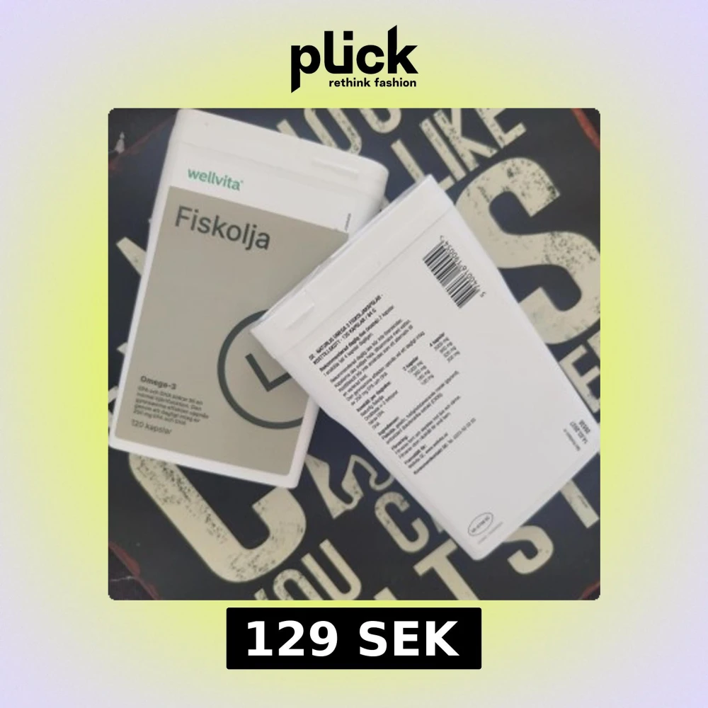 Bilden visar förpackningar med fiskolja (Omega-3) från Wellvita. Självklart nya.
