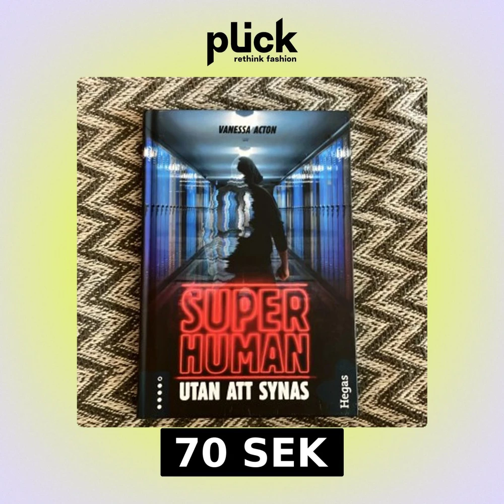 Spännande bok av Vanessa Acton, 'Super Human: Utan att synas', utgiven av Hegas. Omslaget visar en mystisk figur i en korridor med blå skåp och en lysande titel i rött. Perfekt för den som gillar action och mysterier.