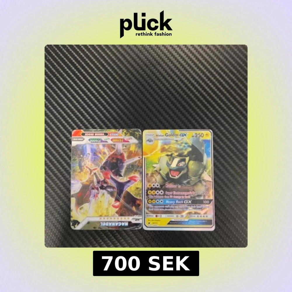 Två coola Pokémon-kort med Naganadel och Alolan Golem GX, perfekta för samlare och fans av Pokémon! Färgstarka och glansiga kort som ger din samling extra power och stil. Passar dig som gillar spel, strategi och att bygga ditt eget Pokémon-team. JAG VET INTE OM DE ÄR ÄKTA !!!