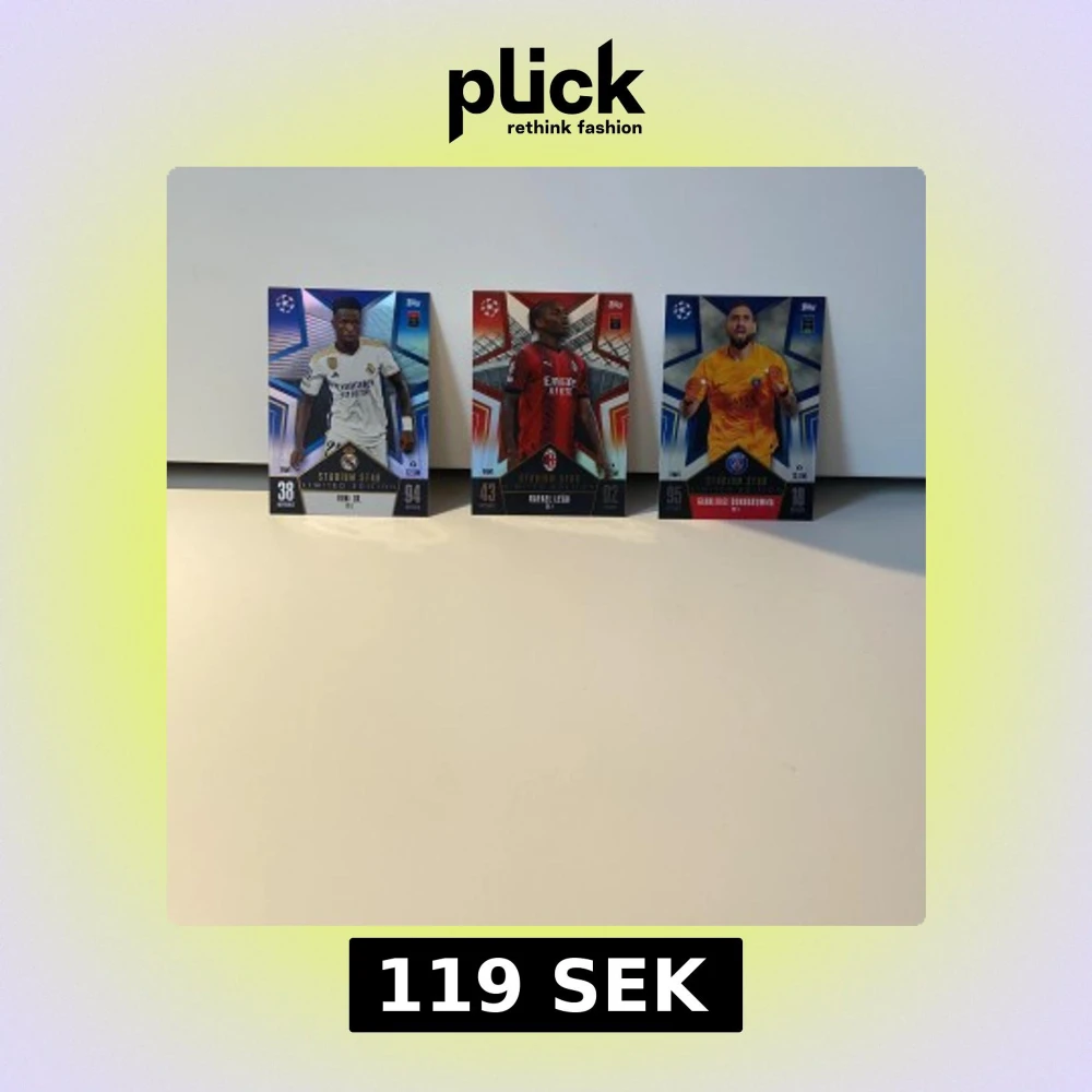 Säljer tre Stadium Star Limited Edition-kort från Topps! Exklusiva fotbollskort med stjärnor som Vini Jr., Rafael Leão och Gianluigi Donnarumma. Perfekt för unga fans och samlare som älskar fotboll och vill ha något unikt i sin samling.