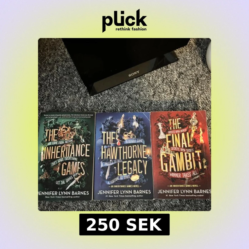 Säljer en spännande boktrilogi av Jennifer Lynn Barnes: 'The Inheritance Games', 'The Hawthorne Legacy' och 'The Final Gambit'. Perfekt för dig som gillar mysterier och intriger. Böckerna har färgglada omslag med detaljerade illustrationer som fångar ögat. En riktig bladvändare för alla bokälskare! Alla på engelska och lästa en gång. 250 för alla tre