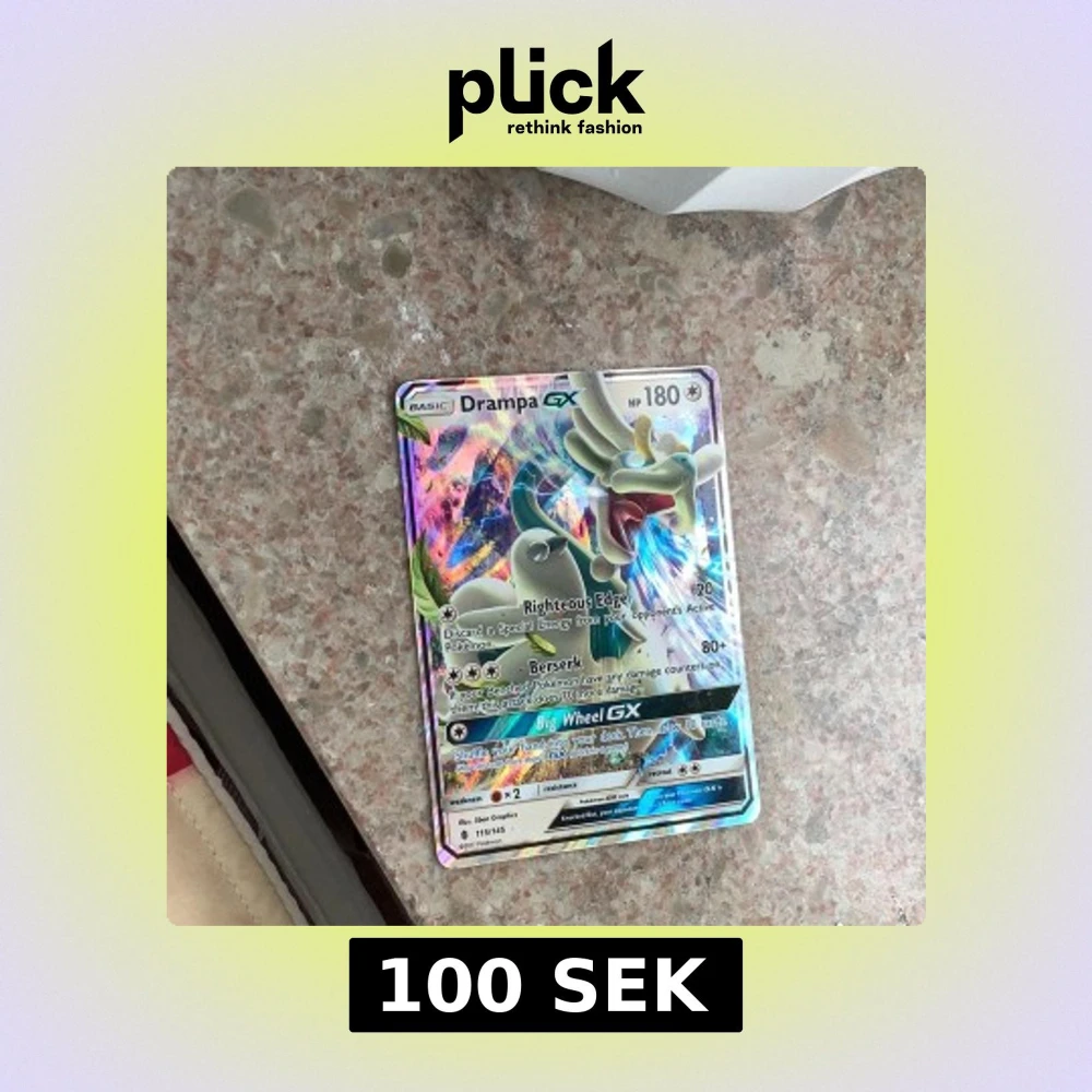 Säljer ett holografiskt Drampa GX-kort från Pokémon-serien. Kortet har färgglad, glansig yta med motiv av Drampa och HP 180. Det är en GX-version med attacker som Righteous Edge, Berserk och Big Wheel GX.