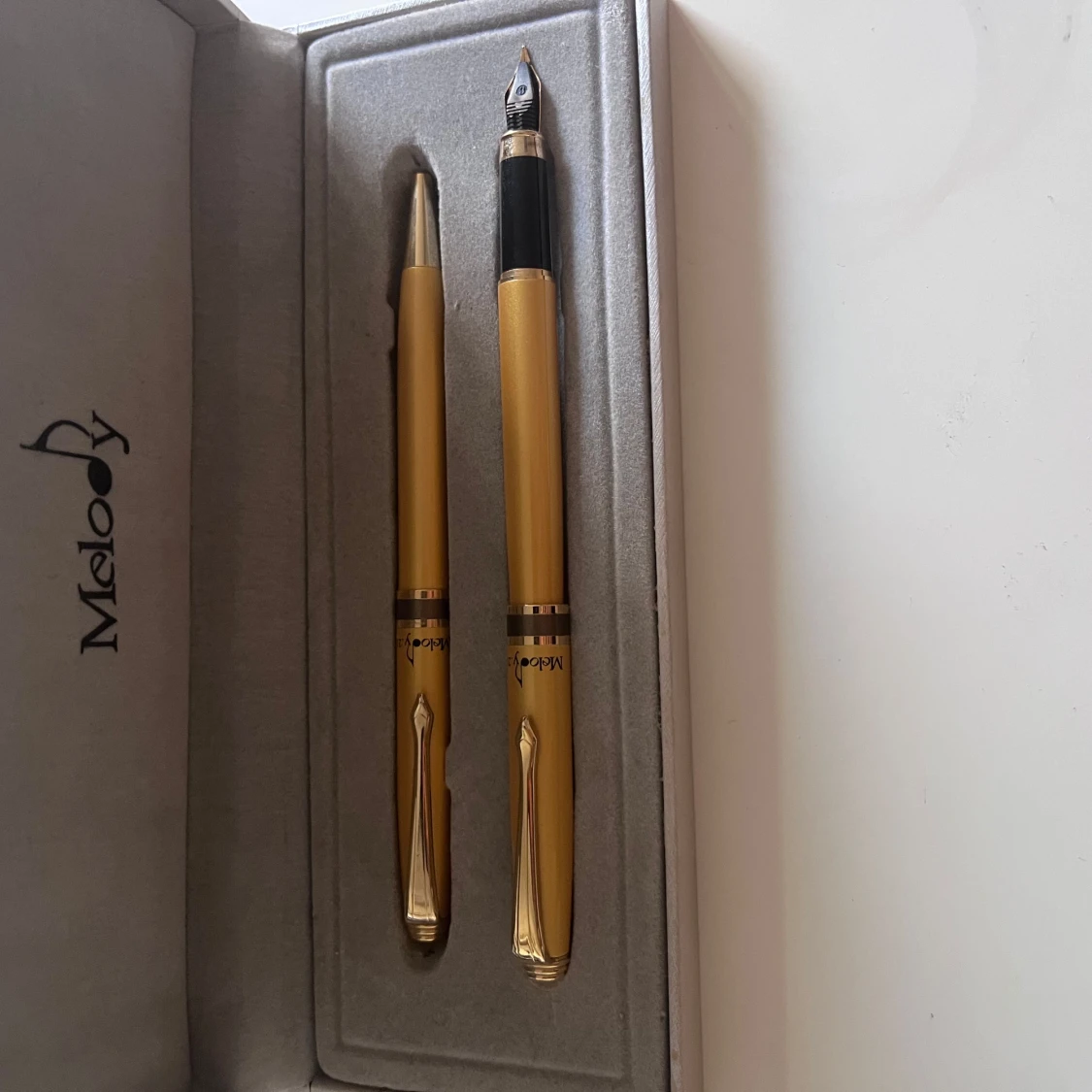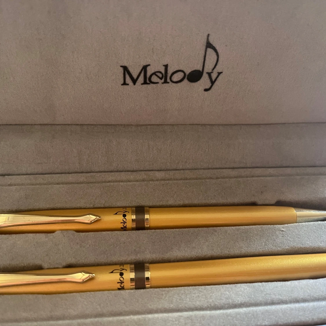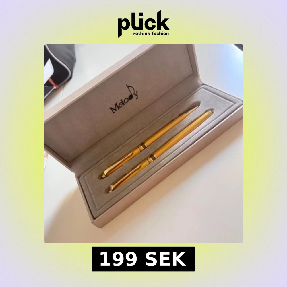 Pris kan diskuteras,Bilderna visar ett exklusivt set med två guldfärgade pennor i en elegant ask med texten 'Melody'. Detta är inte en bok, utan ett pennset som passar perfekt för dig som vill skriva med stil, anteckna eller ge bort som present.