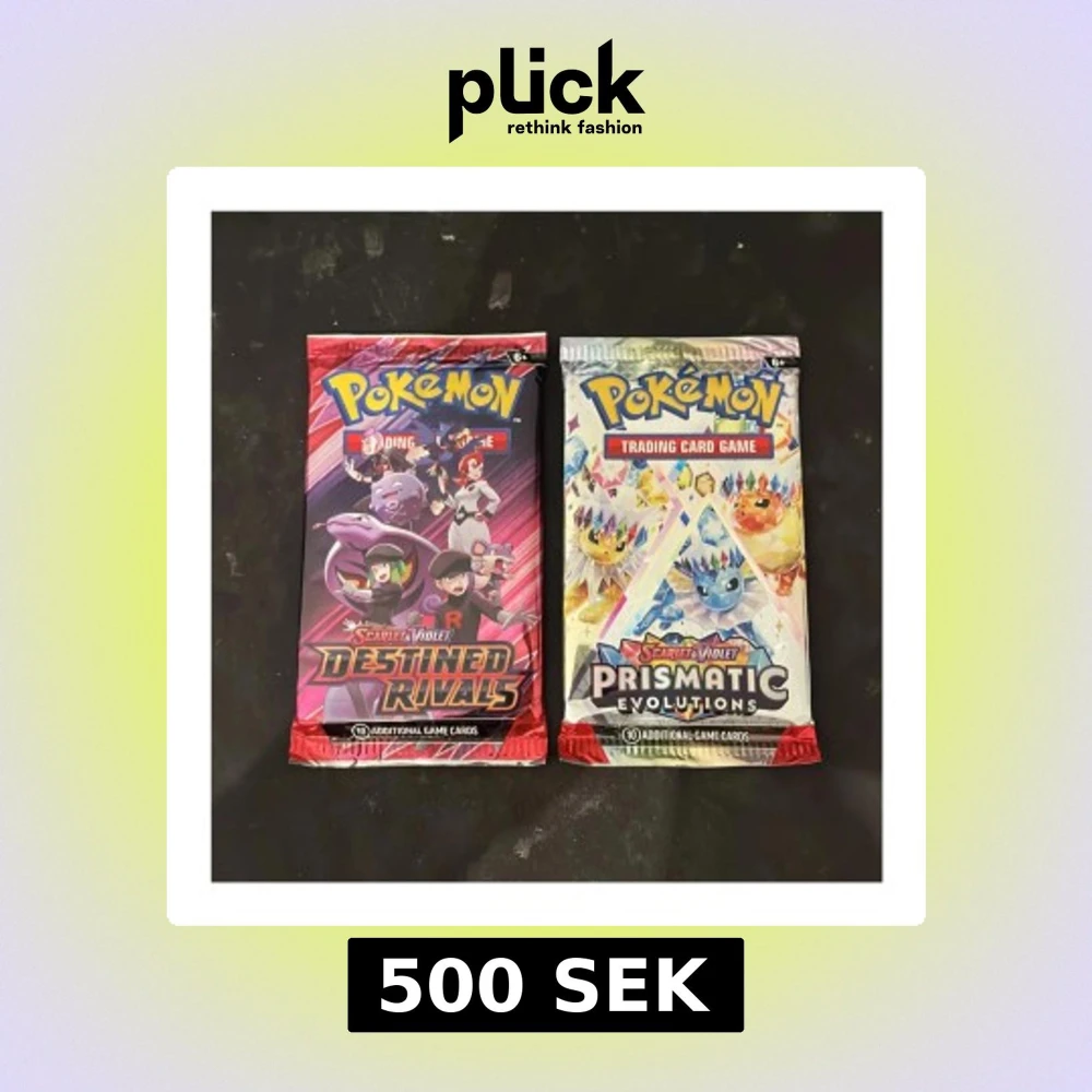 Samling med 6 olika Pokémon Scarlet & Violet och 8st booster packs: Destined Rivals, Prismatic Evolutions, Mega Evolution (fyra varianter), White Flare och Black Bolt. Perfekt för dig som vill utöka din samling eller spela med vänner! Varje paket innehåller 10 spelkort.