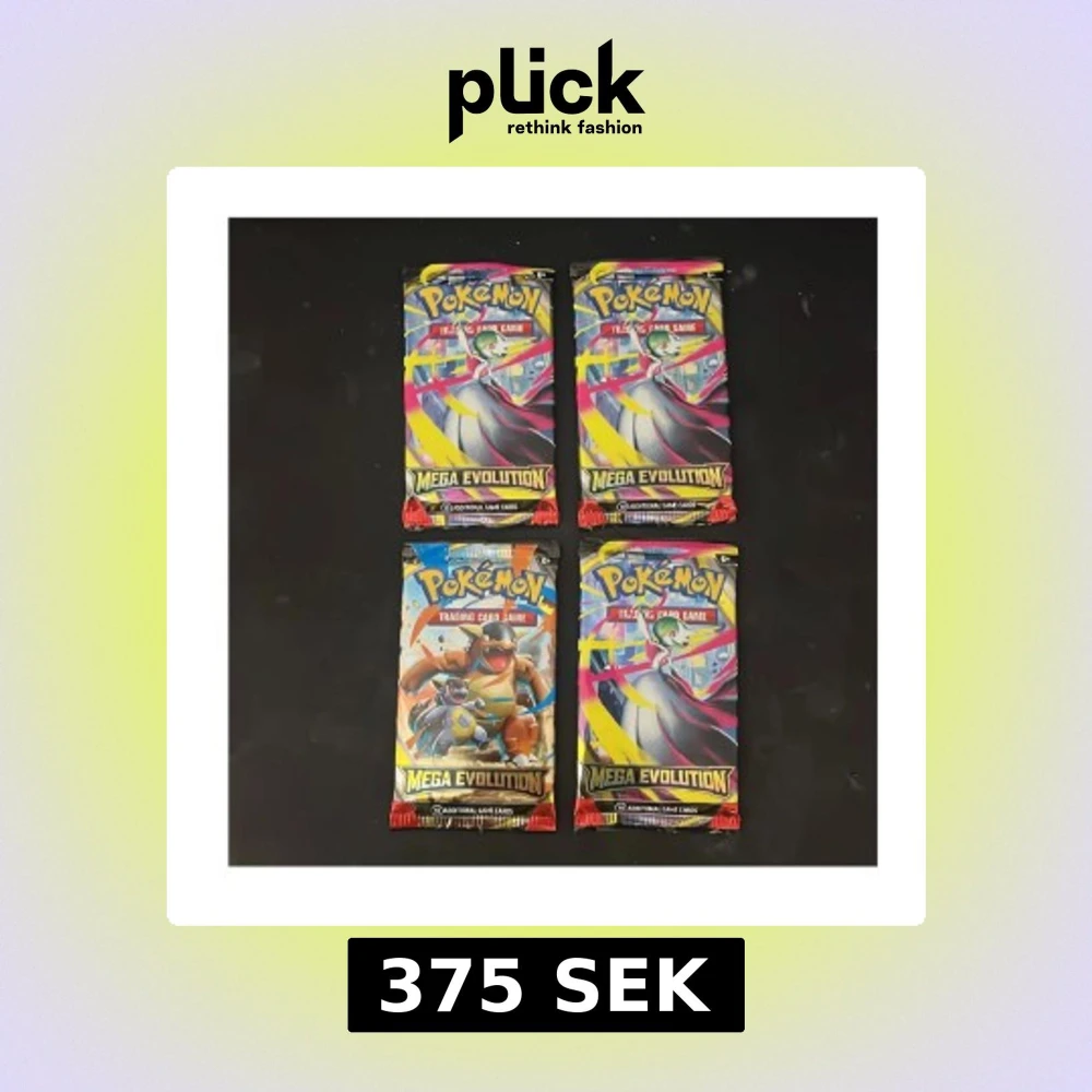Samling av Pokémon Mega Evolution booster packs med färgstarka omslag och populära Pokémon som Gardevoir, Kangaskhan och Venusaur. Perfekt för unga samlare och fans av Pokémon TCG som vill utöka sin kortsamling och spela med vänner.