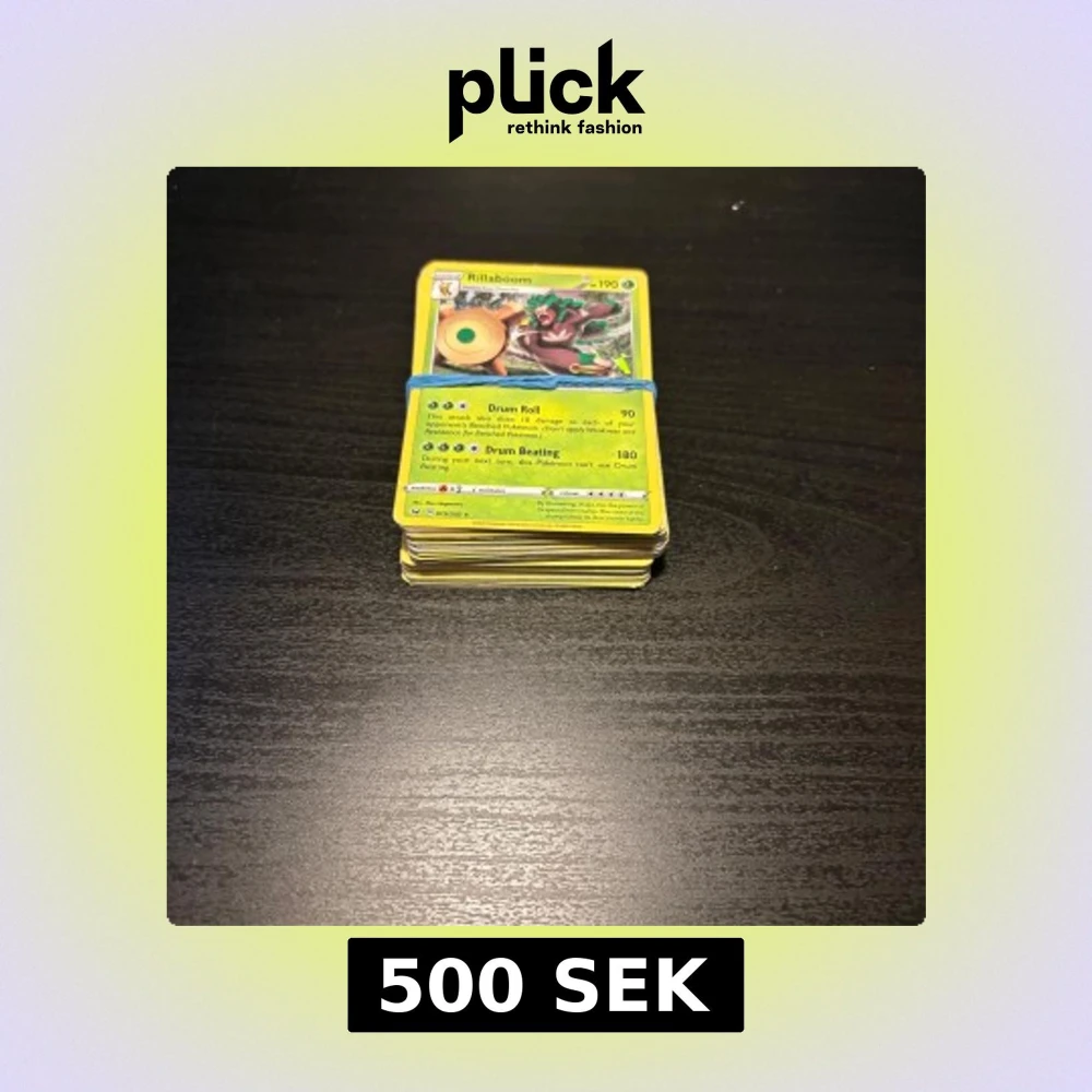 Säljer en bunt Pokémonkort där Rillaboom är det översta kortet. Korten är samlade i en hög och hålls ihop med ett blått gummiband. Perfekt för dig som vill utöka din samling med olika Pokémonkort.