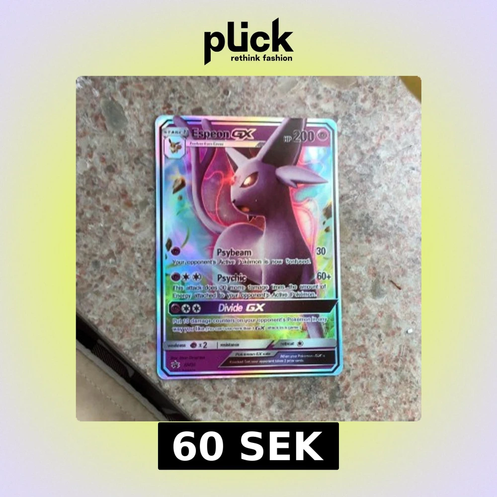 Säljer ett holografiskt Espeon GX Pokémonkort med 200 HP. Kortet har attacker som Psybeam, Psychic och Divide GX. Färgglad design med Espeon i fokus och glittrig yta. Perfekt för samlare eller Pokémon TCG-spelare.