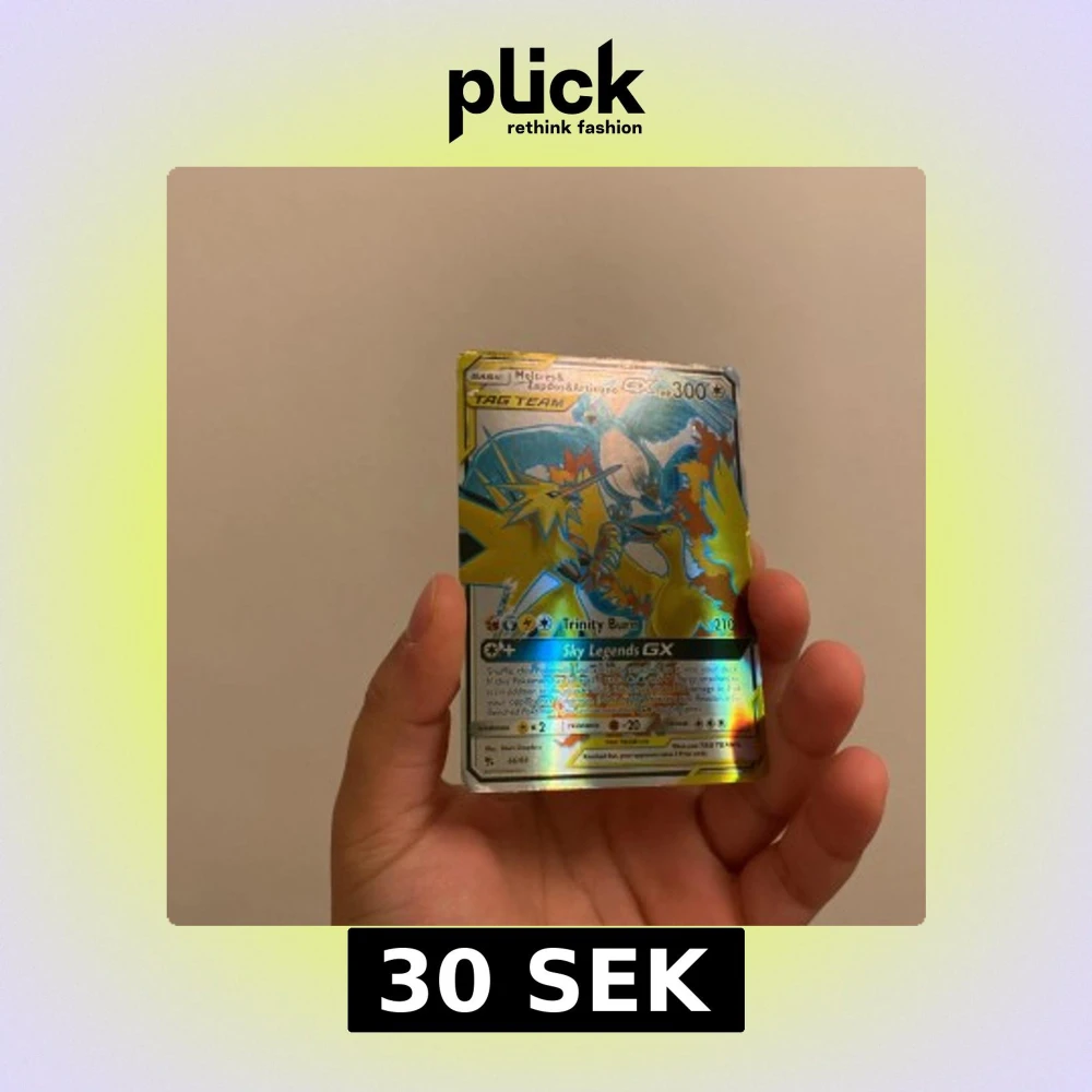 Säljer ett holografiskt Pokémonkort med Moltres, Zapdos och Articuno GX. Kortet har 300 HP och inkluderar attacker som Trinity Burn och Sky Legends GX. Det är en del av TAG TEAM-serien och har nummer 66/68.