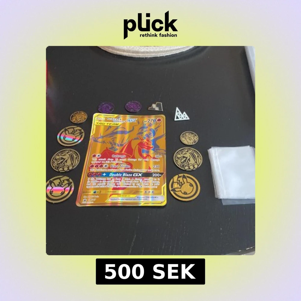 Säljer ett Pokémonkort med Reshiram & Charizard GX. Kortet har en färgglad design med guld och röd bakgrund. Det är en del av Tag Team-serien och har höga attackvärden. Perfekt för samlare eller spelare som vill stärka sin kortlek.