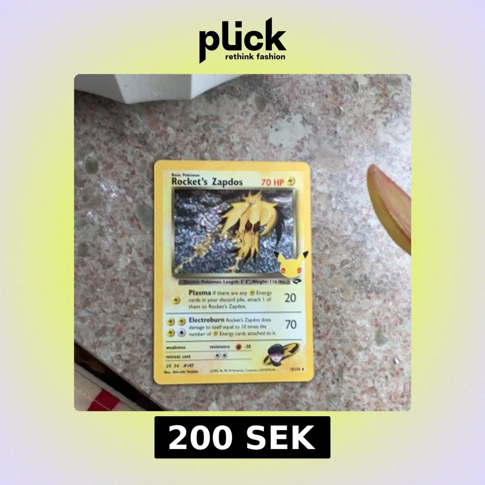 Säljer ett samlarkort från Pokémon, Rocket's Zapdos med 70 HP. Kortet har gul ram och motiv av Zapdos, en elektrisk fågel. Text och illustration på framsidan, baksidan har klassisk Pokémon-design med Pokéboll.
