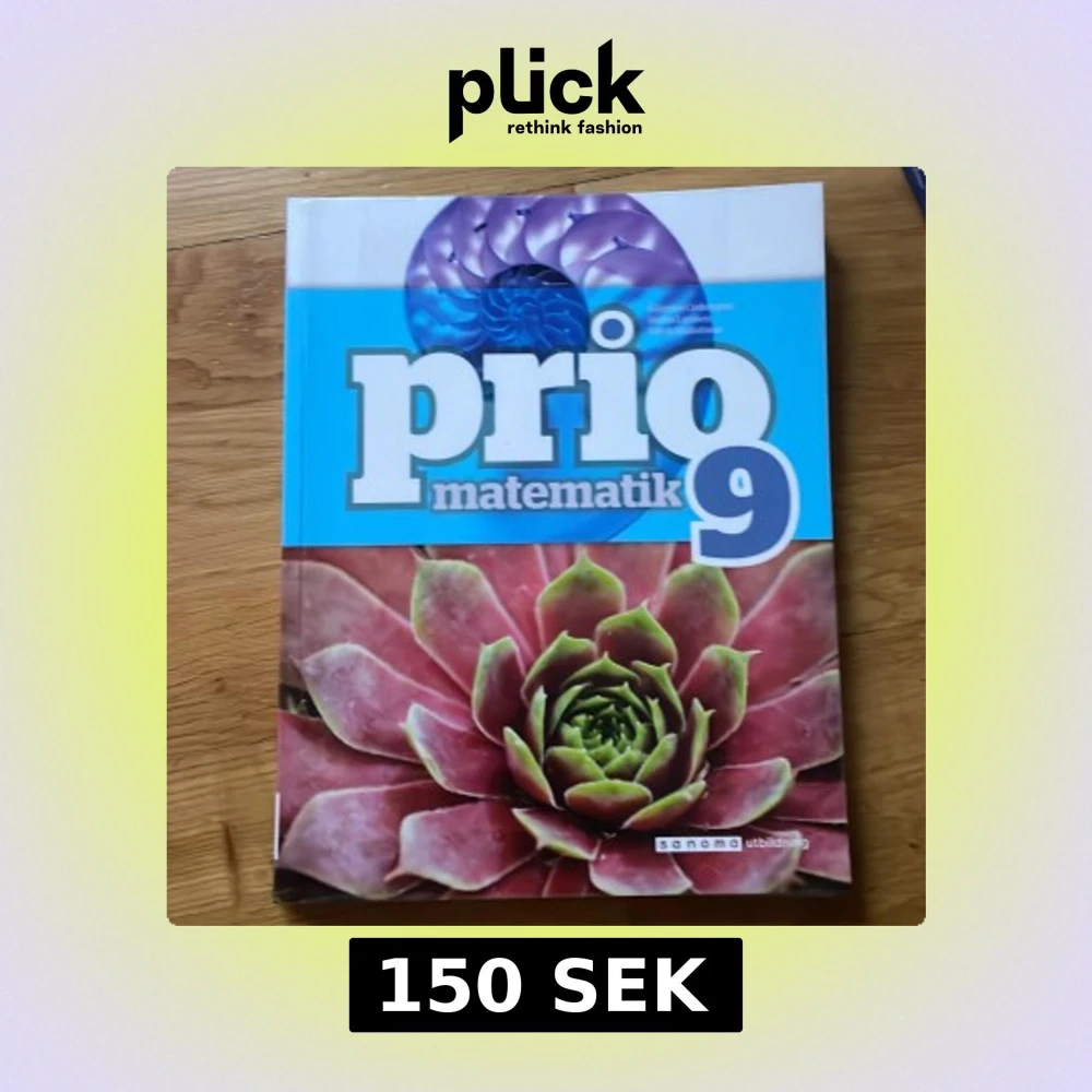 Säljer läroboken Prio Matematik 9 från Sanoma Utbildning. Omslaget har en blå och vit design med stora bokstäver samt bilder på en lila snäcka och en grön-röd växt. Perfekt för dig som pluggar matte i nian.