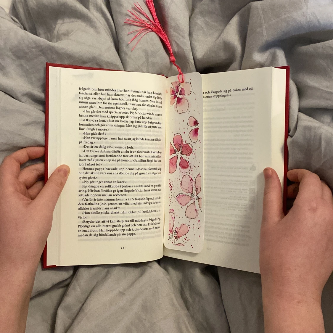 Unikt handgjort bokmärke med vackra rosa blommor i akvarellstil. Bokmärket har en rosa tofs som ger en extra touch av elegans. Perfekt för att hålla koll på var du är i din favoritbok. Tofsen går självklart att byta färg på hör bara av er!