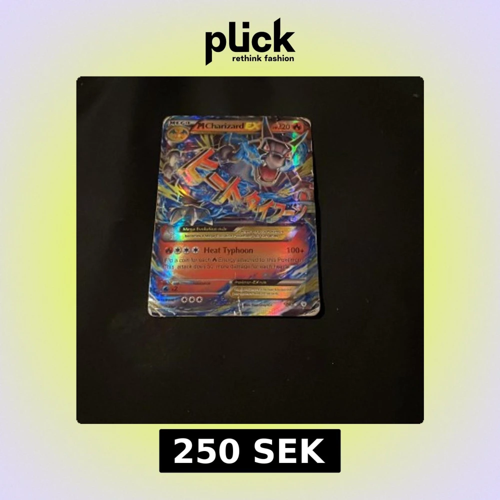 Säljer ett Pokémonkort av typen Mega Charizard EX med holografisk yta. Kortet har färgstark design med blå, orange och silver detaljer samt text på engelska. Baksidan har klassisk Pokémon-logga med pokéboll.