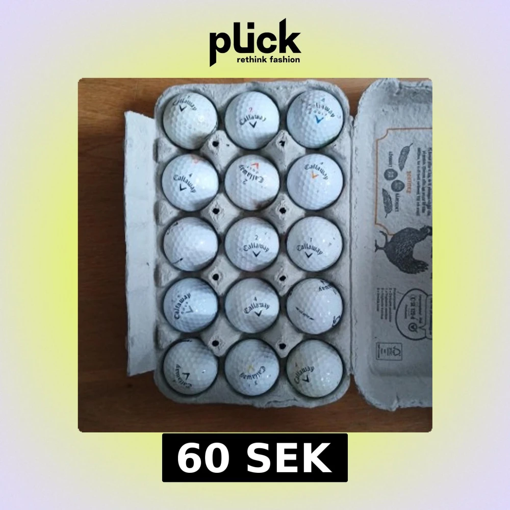 Säljer ett set med 12 vita golfbollar från Callaway, snyggt förvarade i en äggkartong. Perfekt för dig som vill fylla på golfbagen med kvalitetsbollar. Alla bollar har Callaway-loggan och klassisk design.