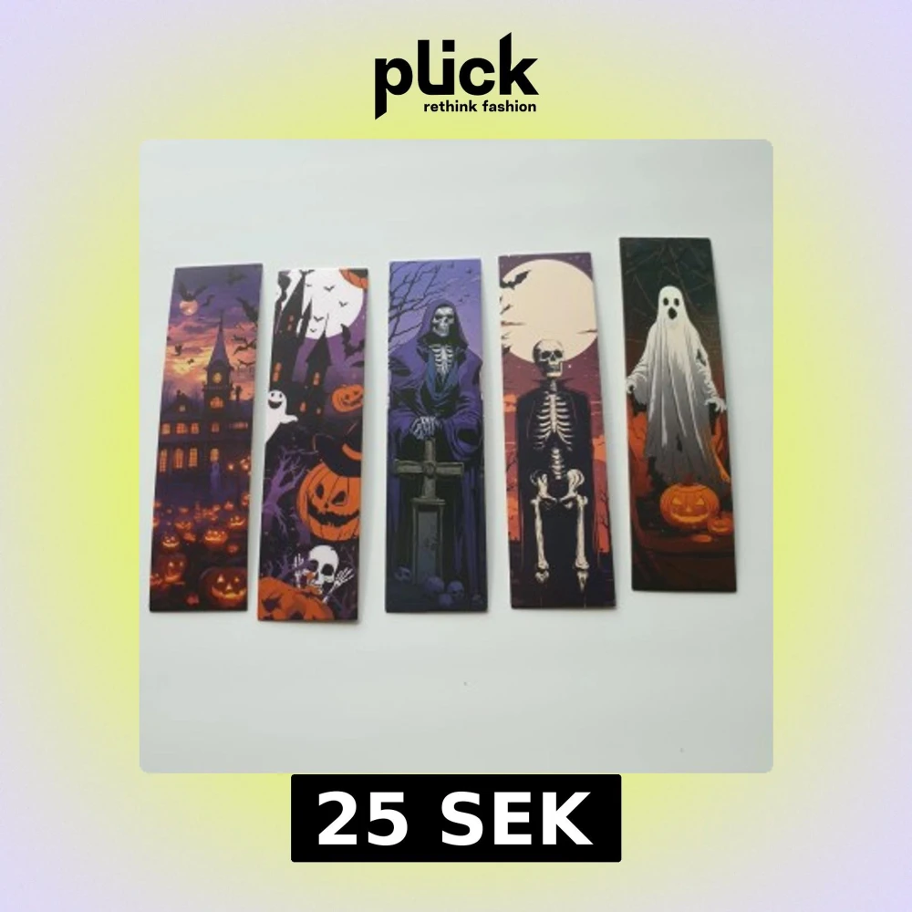 Bokmärken Motiv: lila halloween, skelett, pumpor, spöke Antal: 5st Skick: ny/oanvänd Motiv på ena sidan, vit baksida Storlek: ca 15×4cm