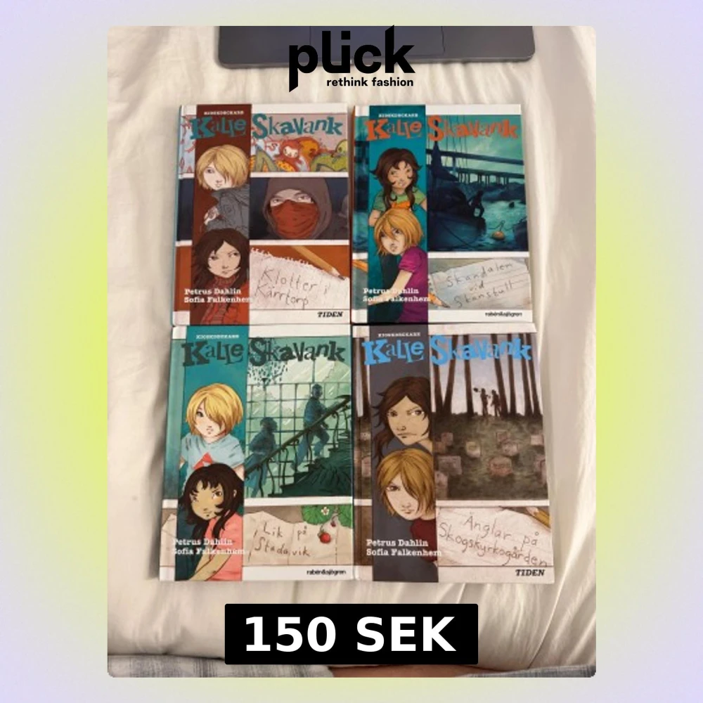 Samling av spännande Kalle Skavank-böcker med färgstarka illustrationer och mysterier att lösa. Perfekt för unga deckarfans som gillar äventyr och kluriga gåtor. Titlar som 'Klotter i Kärrtorp', 'Skandalen vid Slussen', 'Lik på Städivik' och 'Änglar på Skogskyrkogården'. Alla för 150kr annars 45kr/bok
