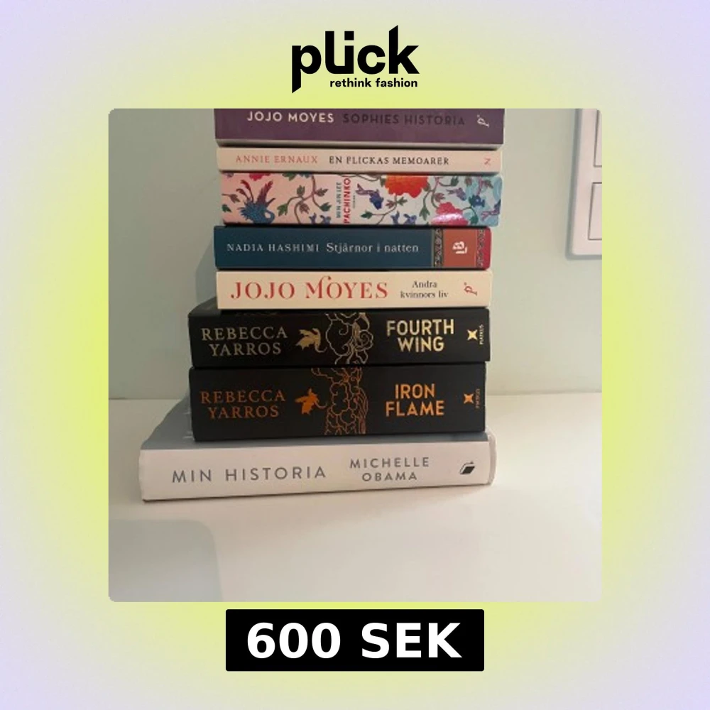 8 olika böcker: fourt wing, iron flame, pachinko, en flickas memoarer, stjärnor i natten, Sophies historia, andra kvinnors liv och min historia- Michelle Obama. Alla böcker är i gott skick, lästa ca 1 gång. Säljer alla tillsammans för 600 kr, 120 kr för iron flame/four wing, 70 kr/övrig bok