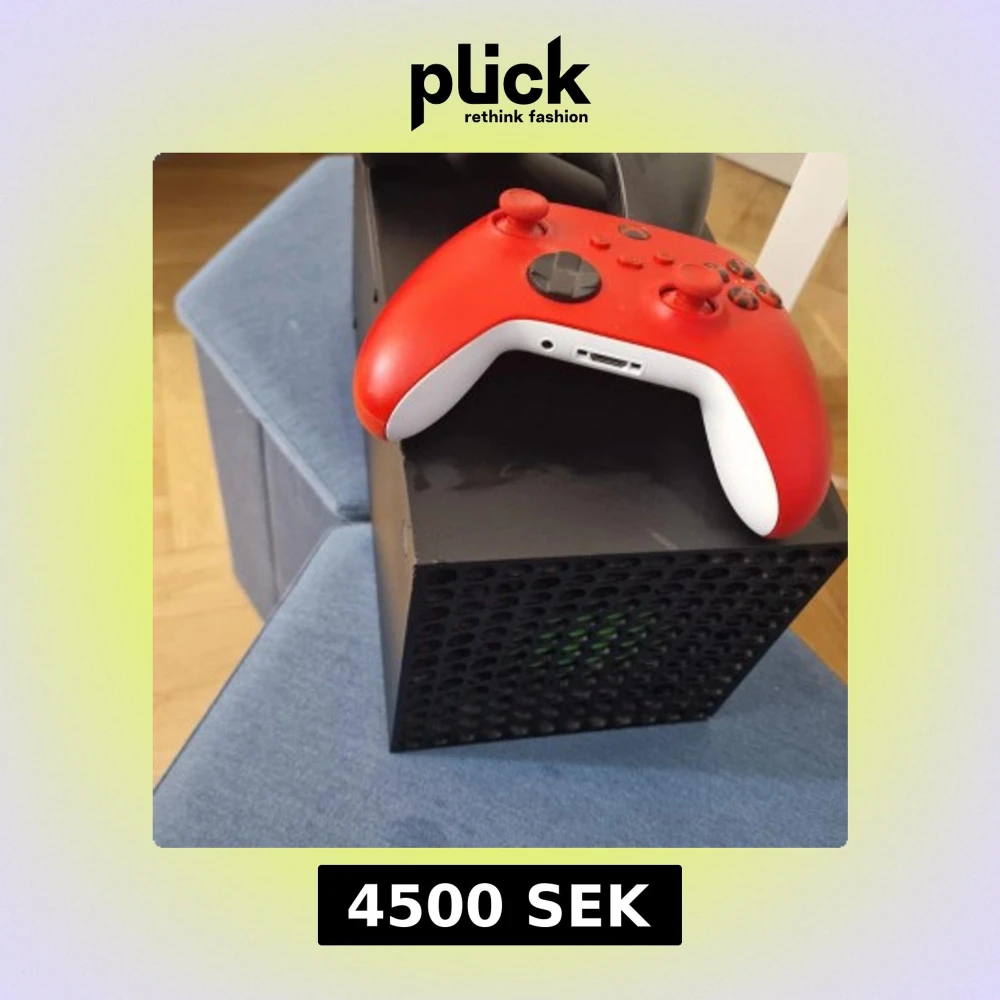 Bilderna visar en Xbox Series X spelkonsol med två handkontroller, en svart och en röd. Detta är ingen bok, utan en spelkonsol för gaming och underhållning.
